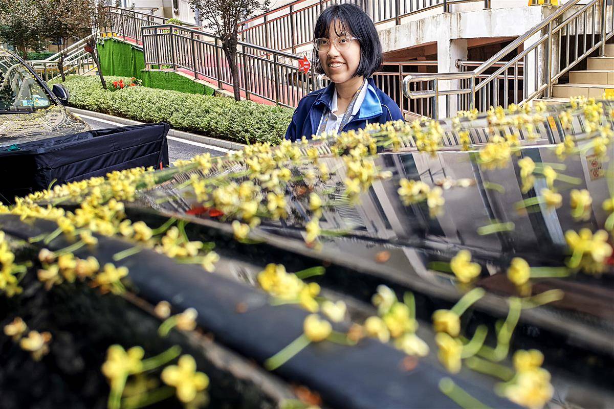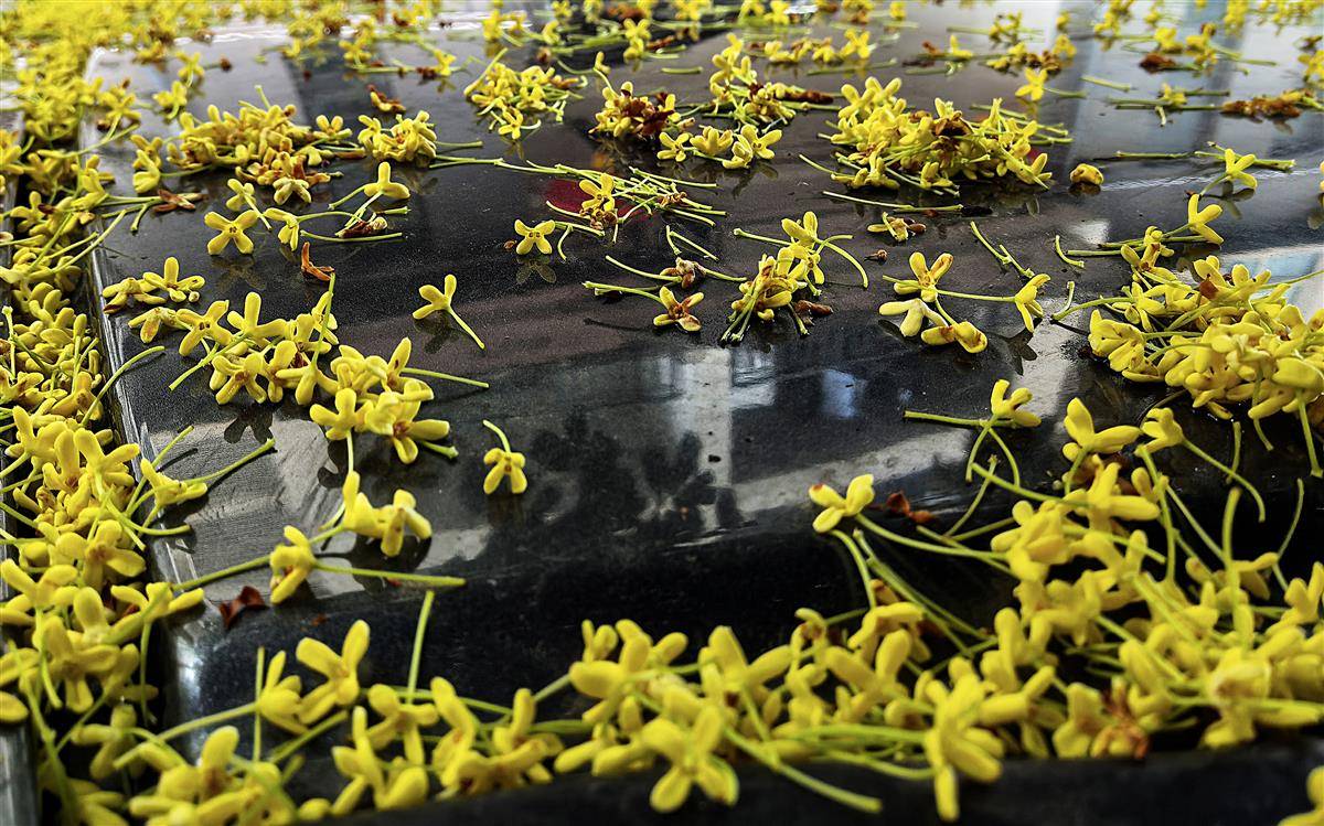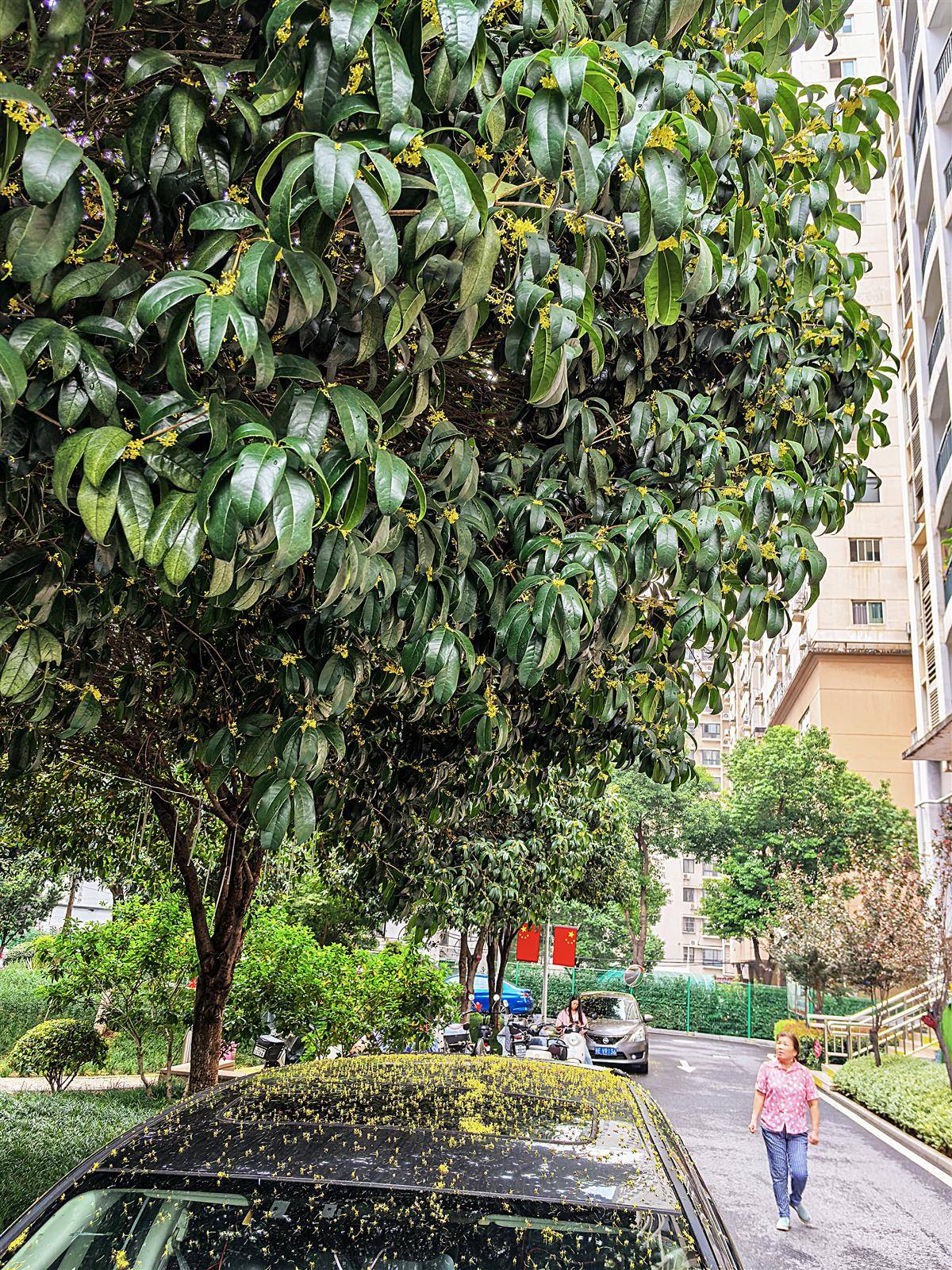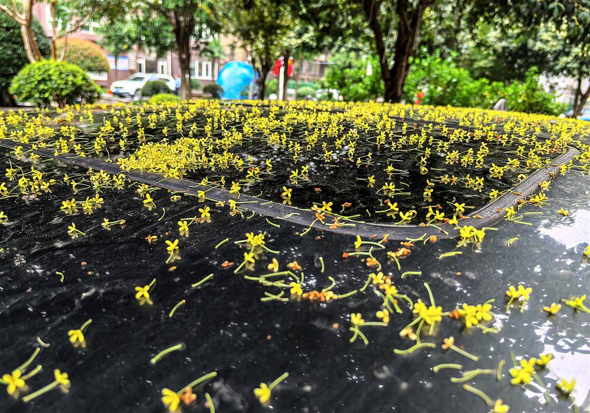 9月30日,武汉洪山侧路某小区里,满院桂花飘香,风里已有桂花香,桂花树下轿车的车窗和车顶上盖着一层桂花瓣,成为秋天里的一道靓丽风景。金秋时节,正是武汉满城桂花飘香的时节。(湖北日报全媒记者 朱熙勇 摄)