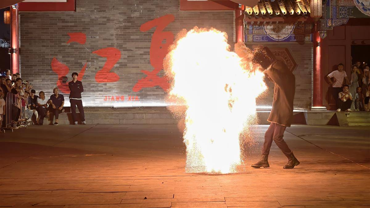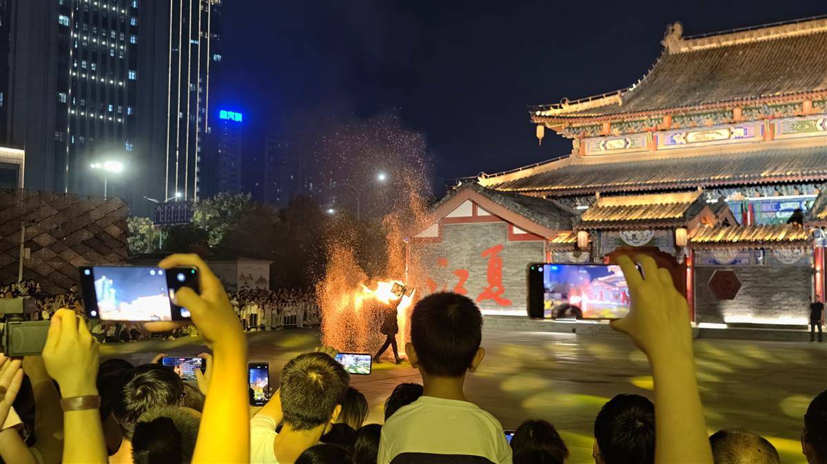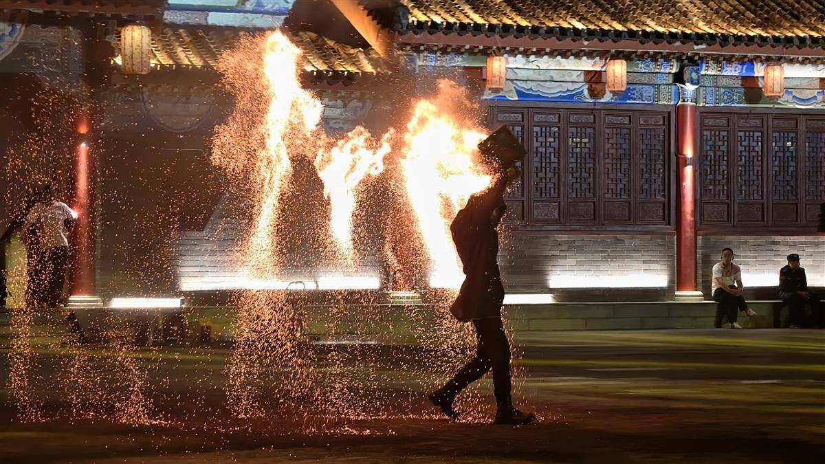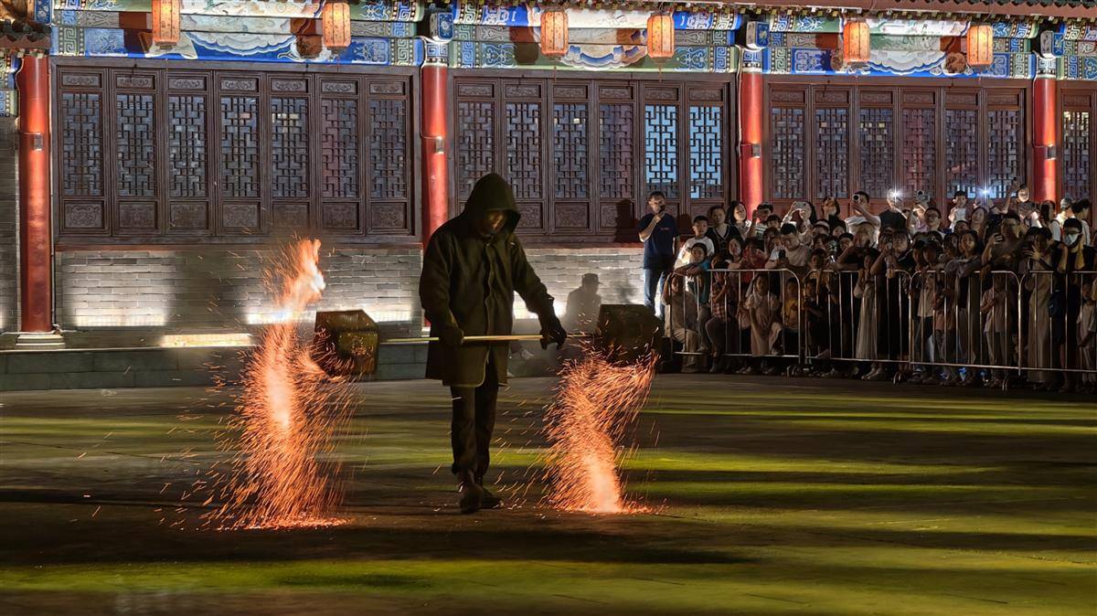 夜幕降临,戏楼前非遗传承人手持火壶,演绎“铁火流光”绝技。火花如星河倾泻,四溅飞舞却秩序井然。惊险与安全并存的表演瞬间引爆全场,绚丽光影将夜游氛围推向高潮,尽显传统艺术的魅力。(湖北日报全媒记者 陈少哲 摄)