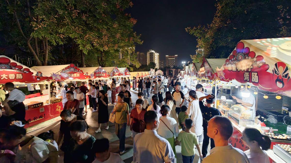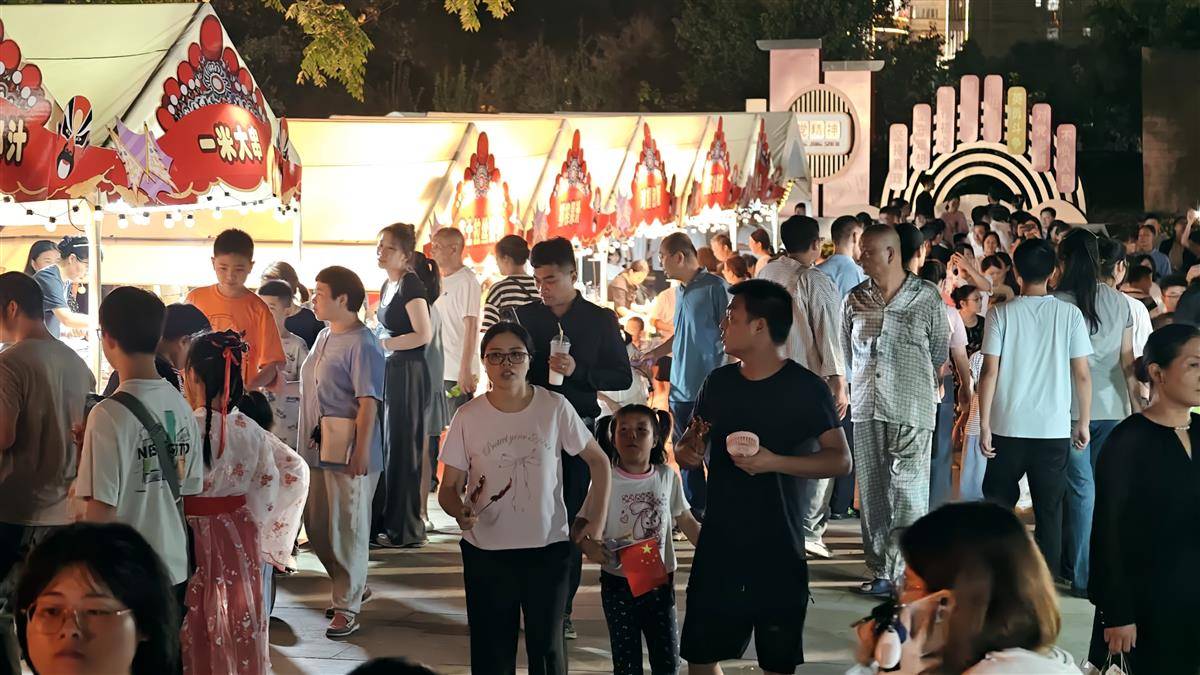 10月1日,武汉市江夏区谭鑫培公园一派节日盛景。美食集市人头攒动,游客们流连于各式摊位前,品尝地道小吃,共享舌尖上的欢愉。