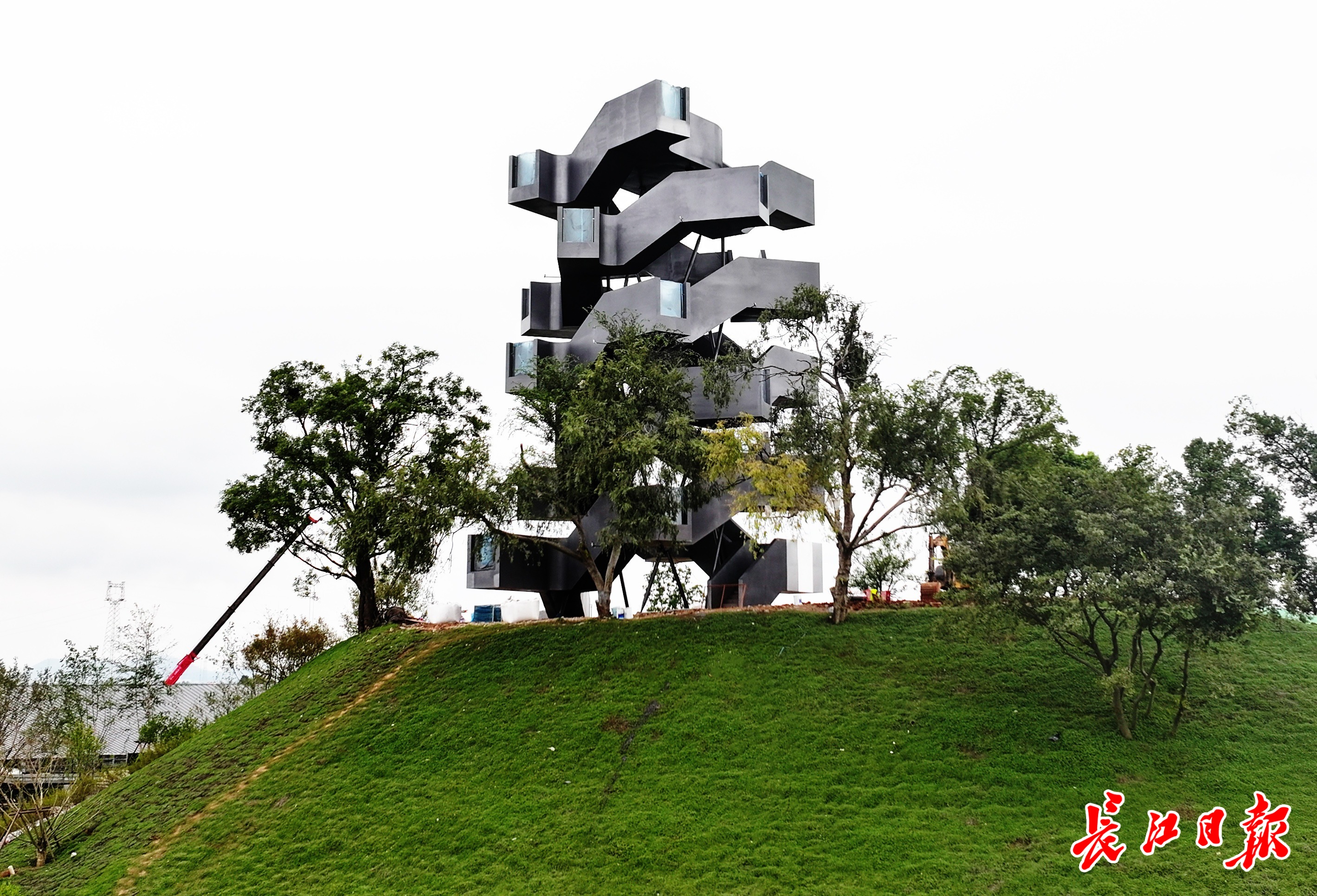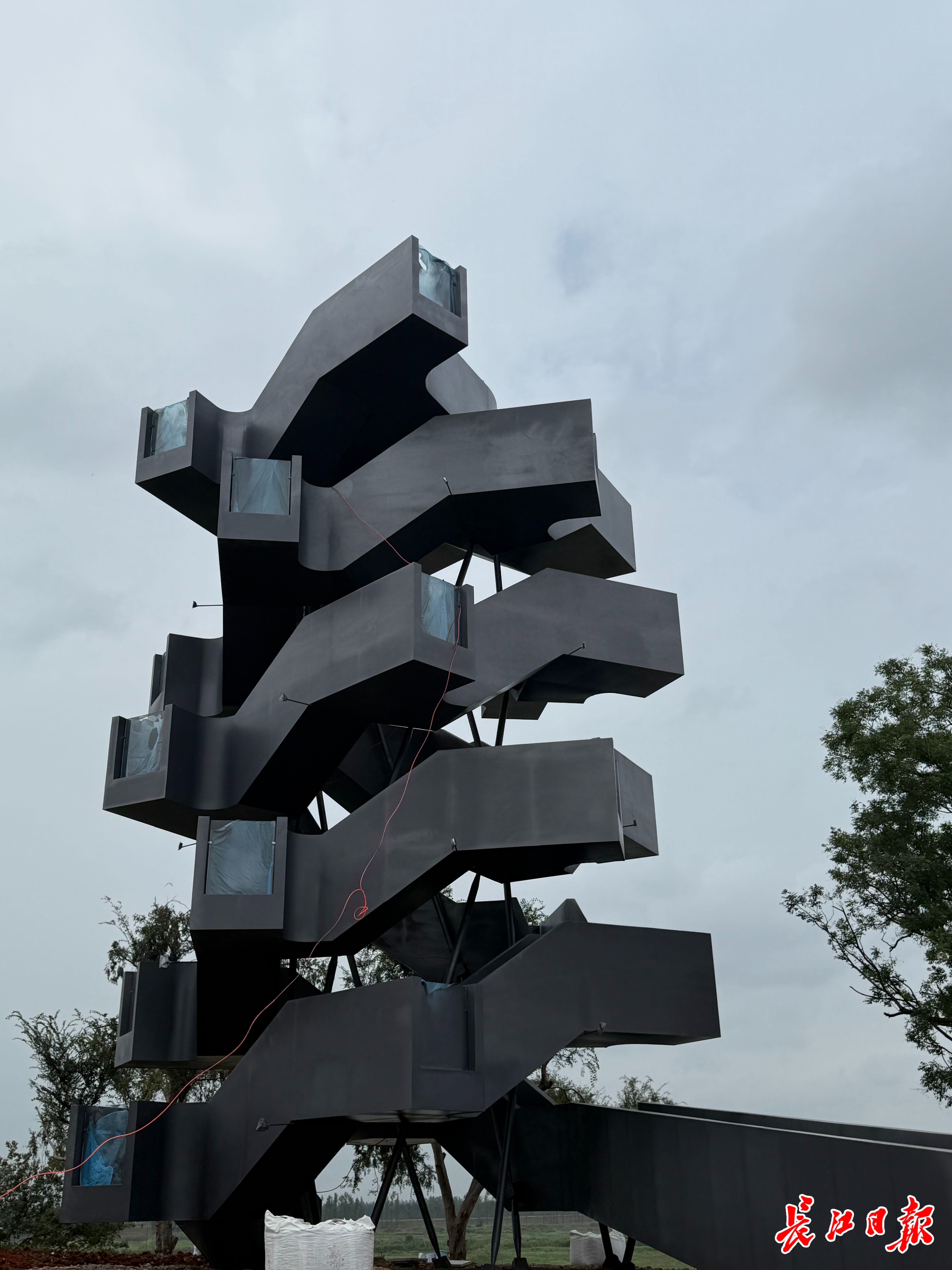 设计方相南建筑事务所相关负责人介绍,修建此塔,既寓意镇山定水,又兼具瞭望功能,是区域性的绝对地标和城市的精神象征。玲珑塔采用双螺旋结构设计,既平衡塔身使结构更稳定,又通过双楼梯接地利于消防疏散。在动线设计上,游客不走回头路,流线顺畅有趣。同时,也与小镇三大定位之一的“爱情小镇”相契合。玲珑塔高16.9米,是沉湖湿地的地标建筑,也是沿江视觉的制高点和中心。塔身设有多处观景点,随着高度攀升,每个观景点都能从不同角度俯瞰四周景观,观景人亦融入塔身景观之中。