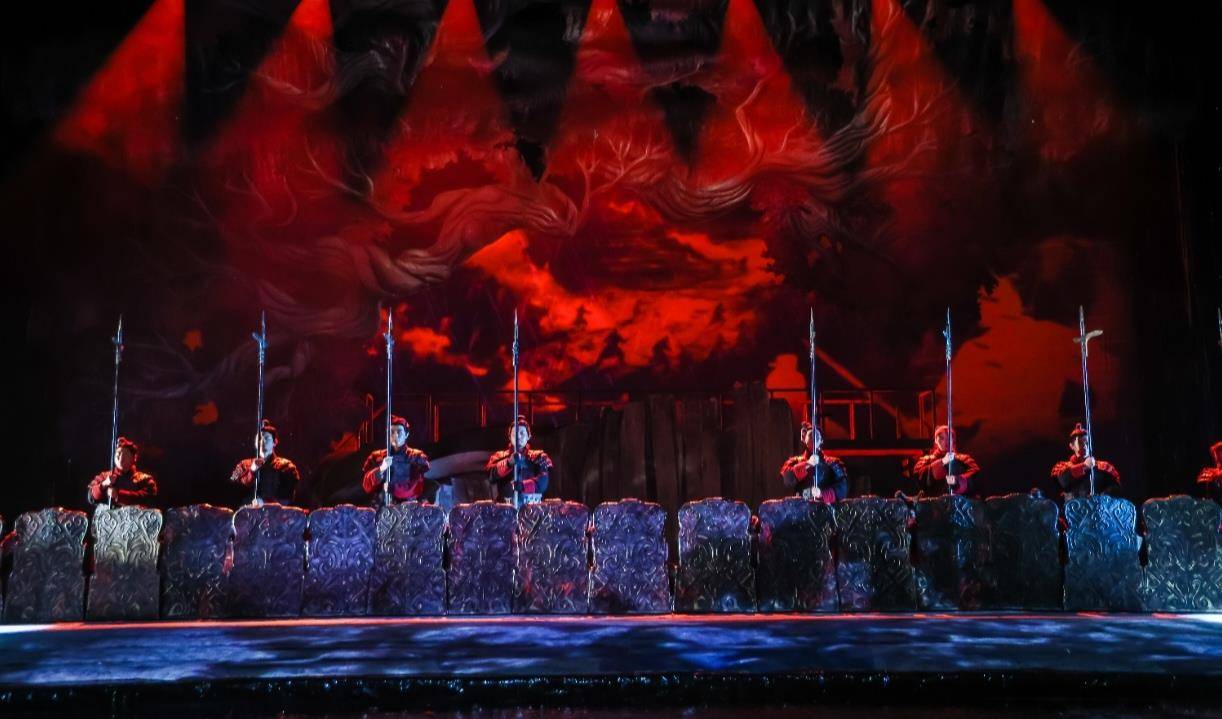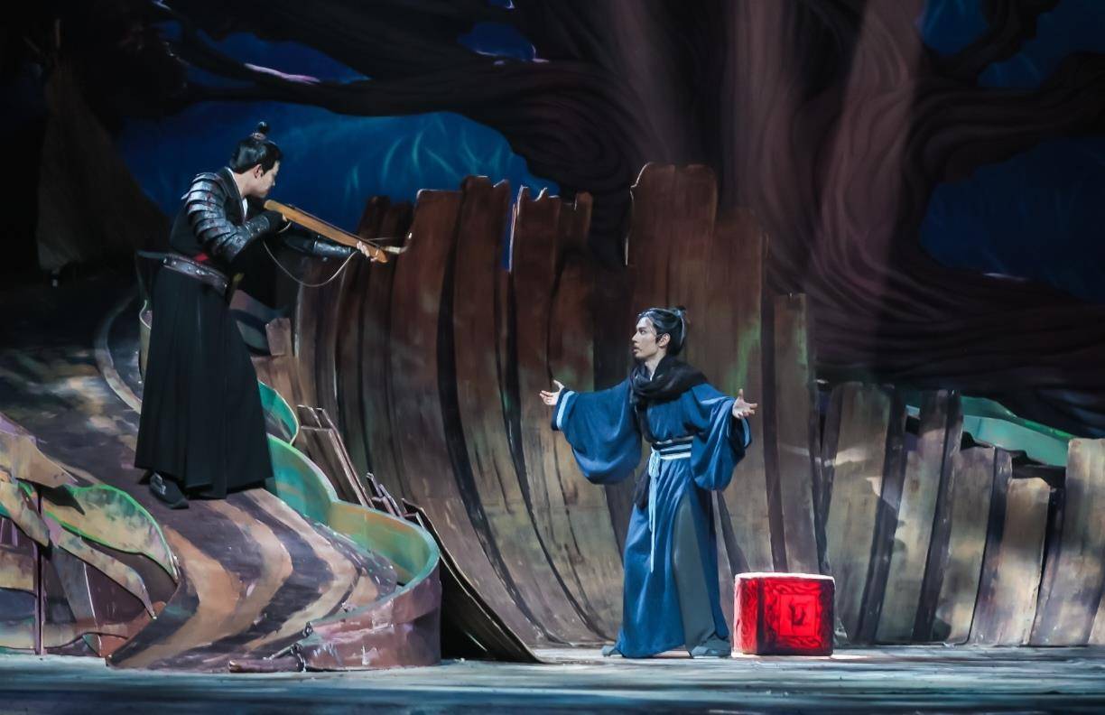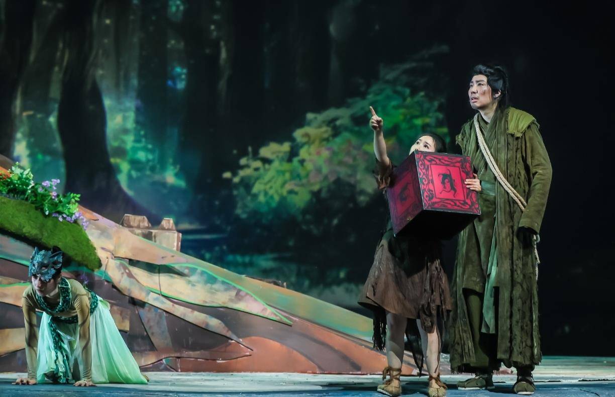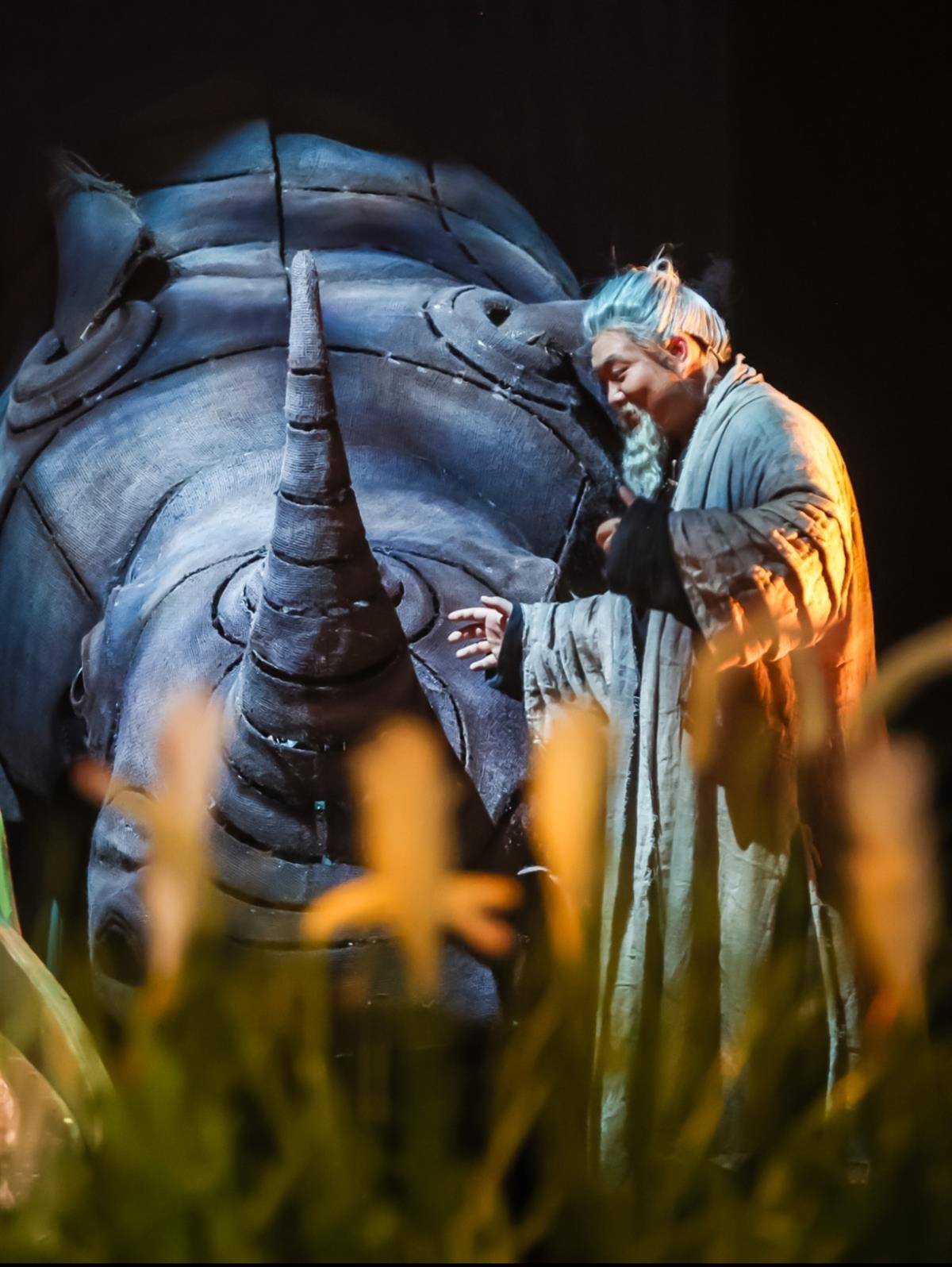 该剧在舞台呈现上实现多项突破。旋转舞台与多维投影再现了云梦大泽的浩瀚景象;穹顶长庚星与流转星河营造出独特的时空穿越感。剧中,巨型犀牛低沉长啸,震撼全场。“山鬼”祭祀段落中,白色烟雾、空灵鼓声与古老吟唱交织,尽显楚地巫风的古老神秘。
