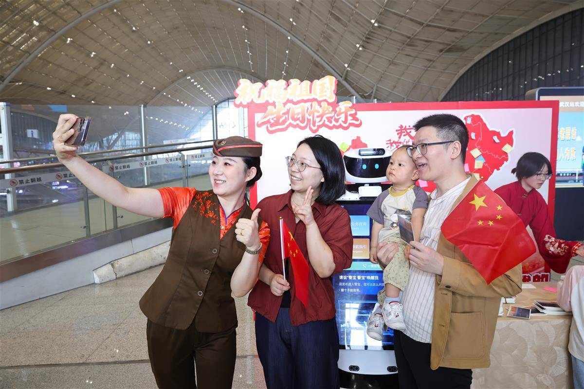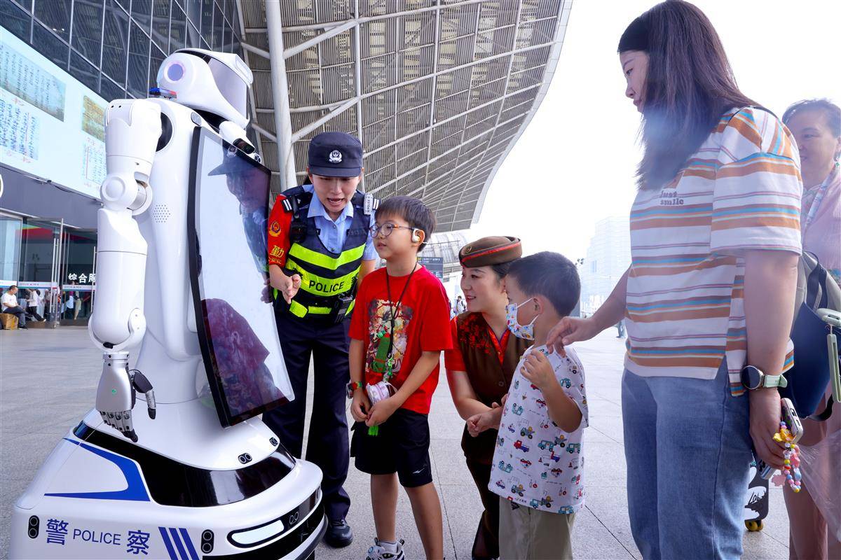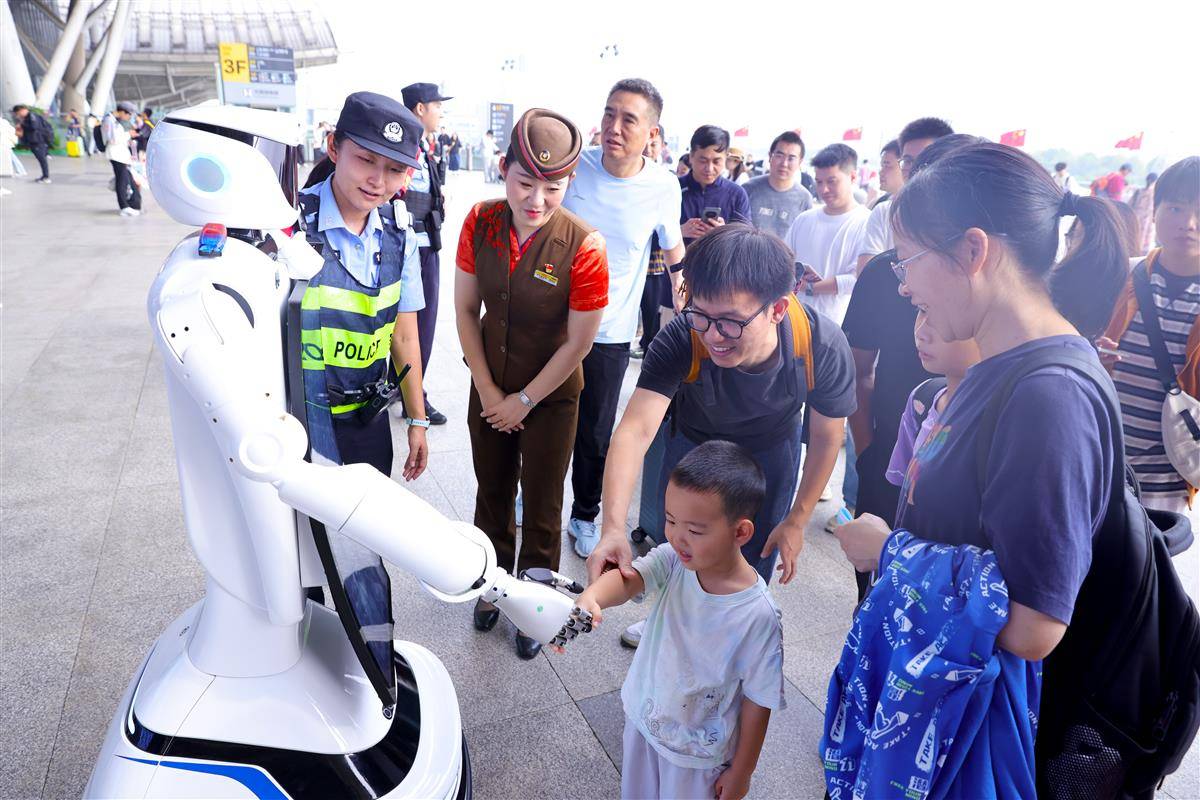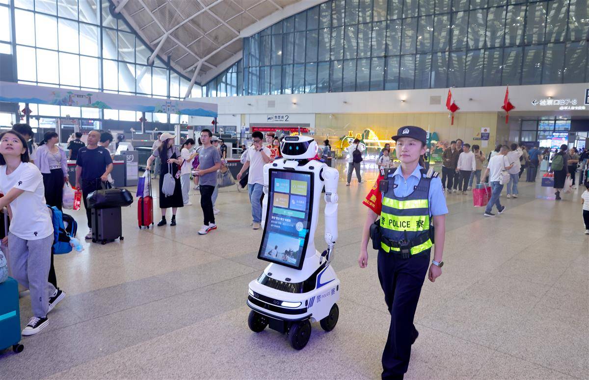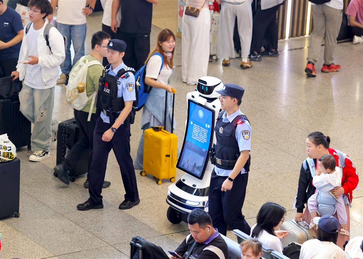 10月1日,武汉铁路公安处武汉站派出所的“警宝”机器人在国庆假期正式上岗。“警宝”不仅能实现定点巡逻、一键报警,还能问路答疑、站内导航带路、开展反诈宣传。国庆长假首日,武汉火车站旅游流、探亲流与学生流交织叠加形成出行高峰,武汉站10月1日发送旅客16万多人次。武汉站派出所实行“潮汐式”部署警力,在客流密集区动态值守,确保进出站通道畅通有序。武汉客运段聚焦旅客出行需求,通过实时分析各线路客流数据,精准研判热门方向运力缺口,动态加开多趟夜行高铁,有效缓解重点线路“一票难求”的压力,为旅客灵活调整出行计划提供更多选择。(湖北日报全媒记者 魏铼 通讯员 王玉琪 余梦青 摄)
