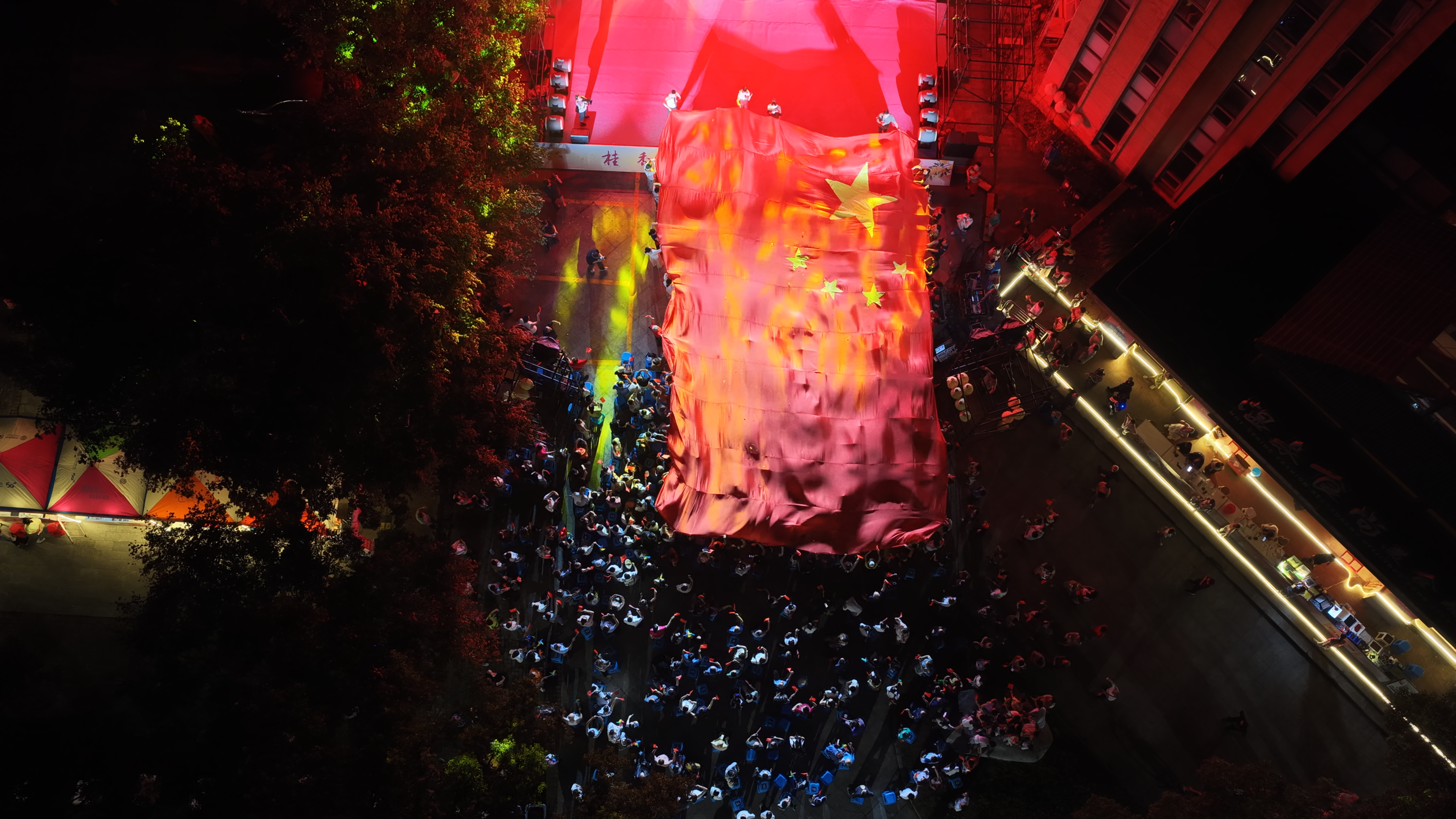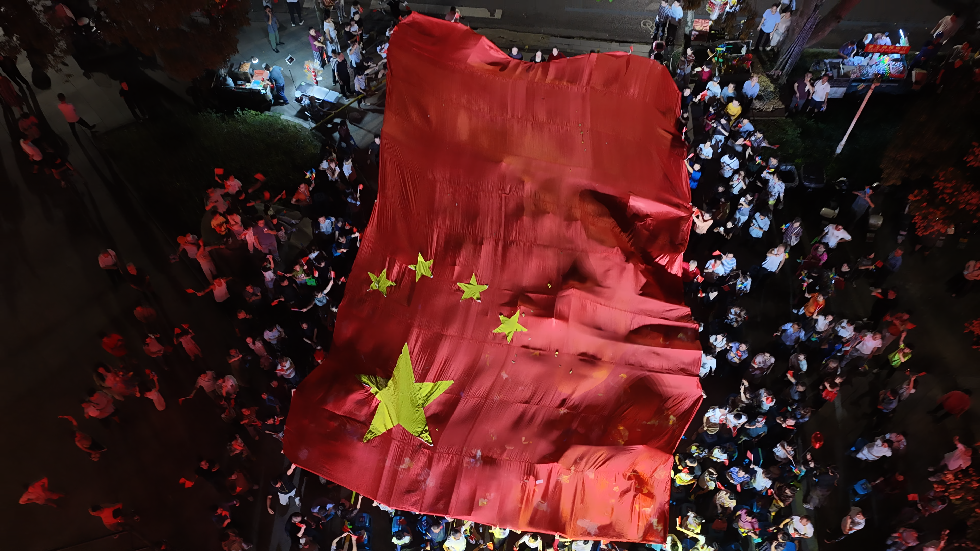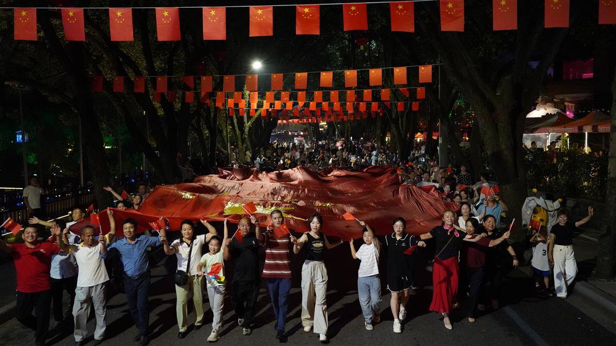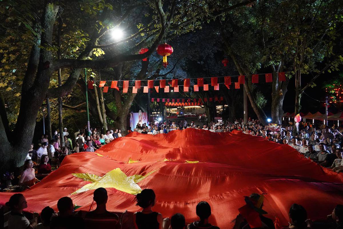 10月1日夜晚,咸宁市咸安区月亮湾街区,巨幅国旗徐徐铺展,万人众声合唱《我和我的祖国》,用滚烫的旋律为祖国生日献礼。