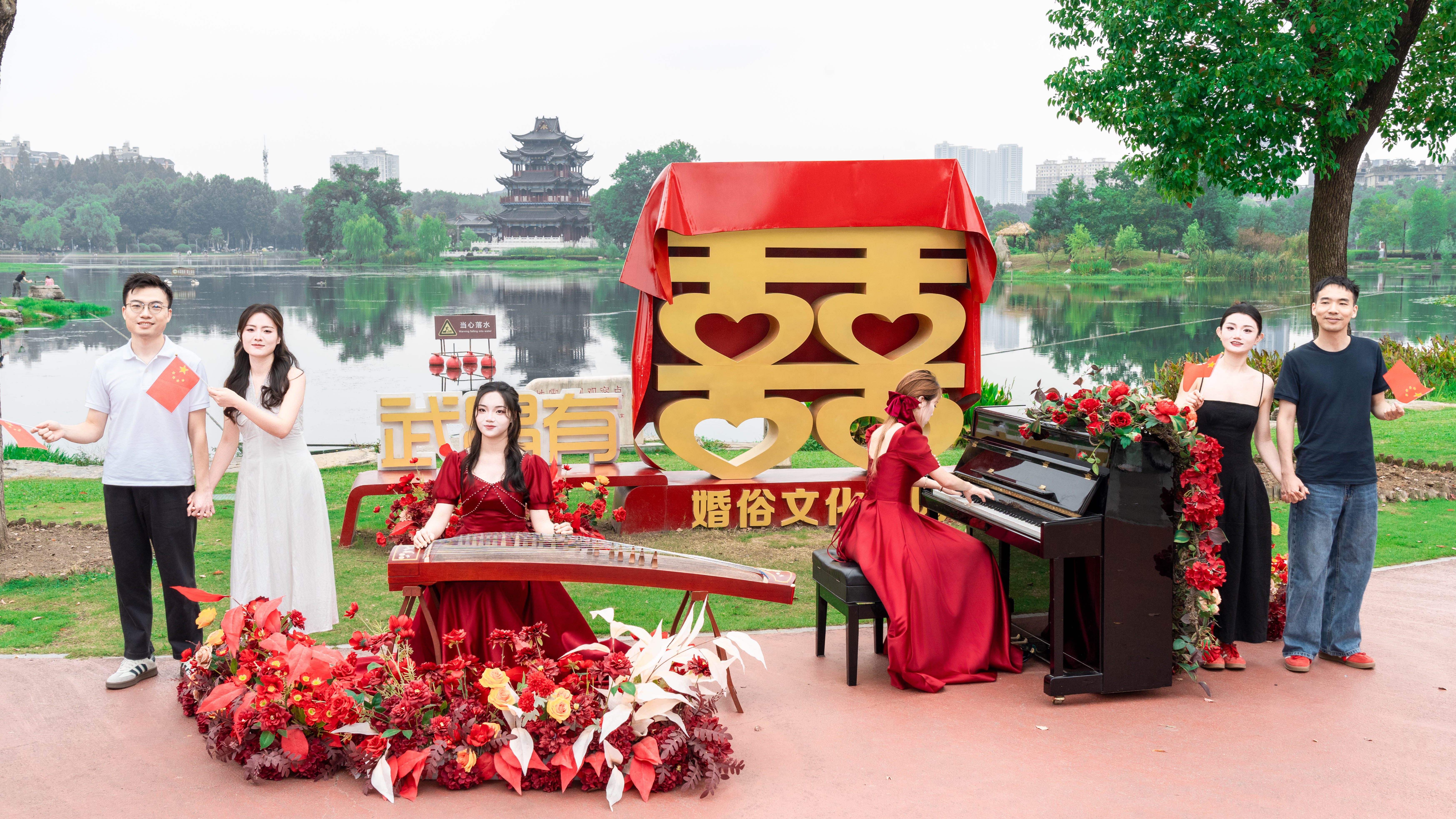 当天上午,在华中师范大学和武汉音乐学院大学生志愿者的伴奏下,现场两对新人共同唱响《如愿》。钢琴与古筝交织出悠扬旋律,琴瑟和鸣,歌声里既有对祖国的深情告白,也有对未来的美好憧憬,更许下了共建和睦小家的坚定承诺。