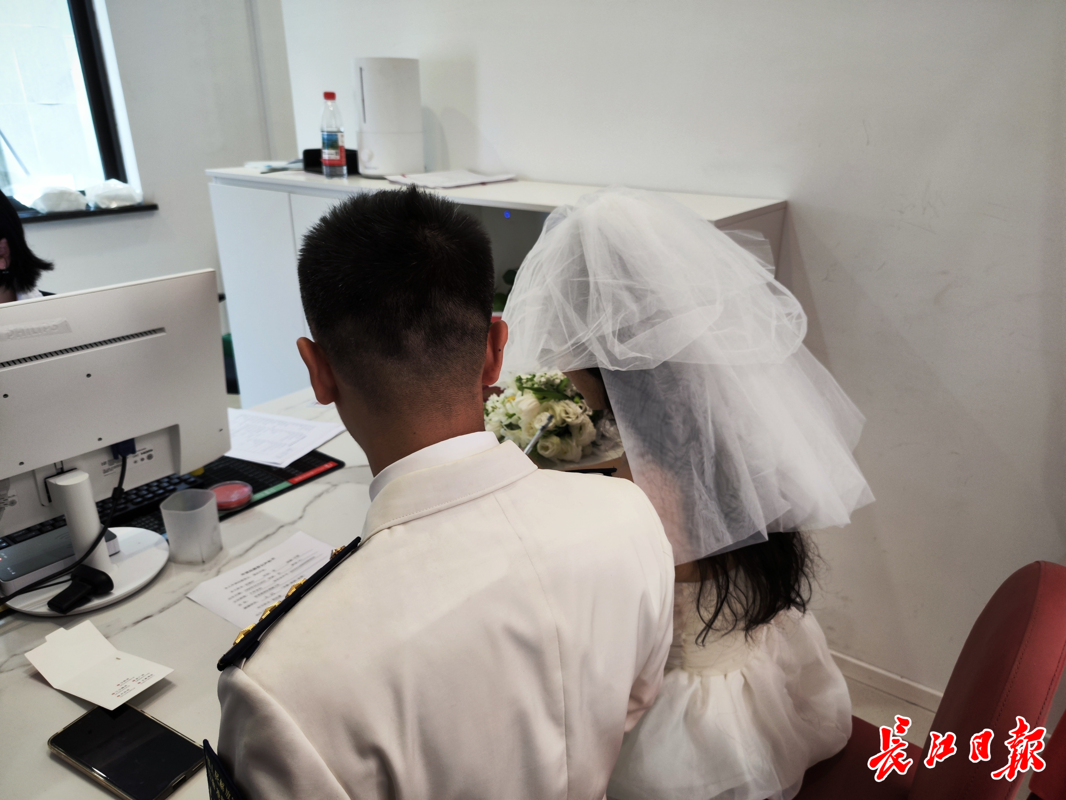 胡女士和小孙都是党员,去年相恋,今年决定步入婚姻。小孙是一名现役军人,入伍8年有余,这次特意从驻地赶回武汉登记。他一身洁白军装,英姿飒爽;身旁的胡女士笑意温婉:“我爸爸也是军人,我特别欣赏军人身上那股甘于奉献、舍生忘死的精神。”