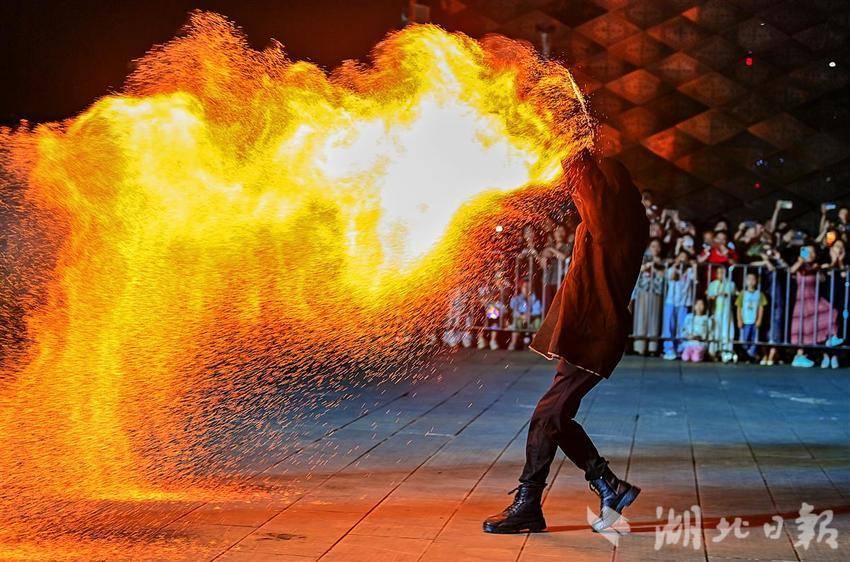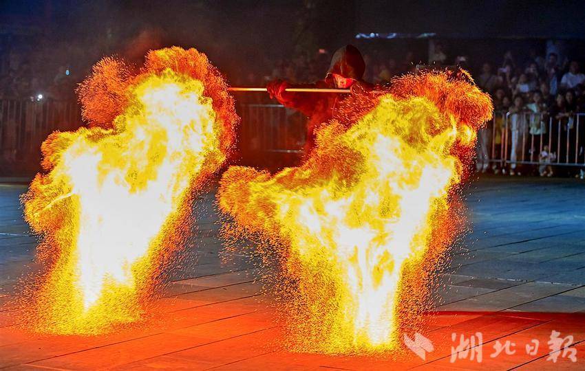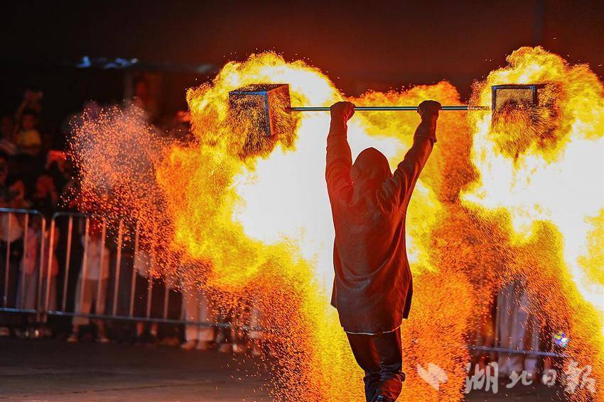 10月2日晚,武汉江夏区谭鑫培公园戏楼广场上,一青年男子的中国非遗火壶表演,火树银花场面震撼引发关注。表演者将烧好的木炭放入两边的铁网,通过抖动产生火花,现场一片火树银花。据悉,火壶表演是国家级非物质文化遗产之一,寓意驱疾避祸,百家安宁。(湖北日报全媒记者 朱熙勇 摄)