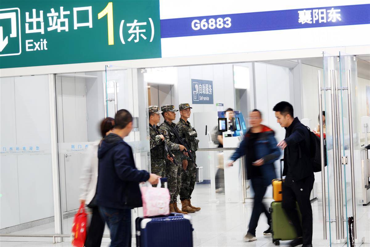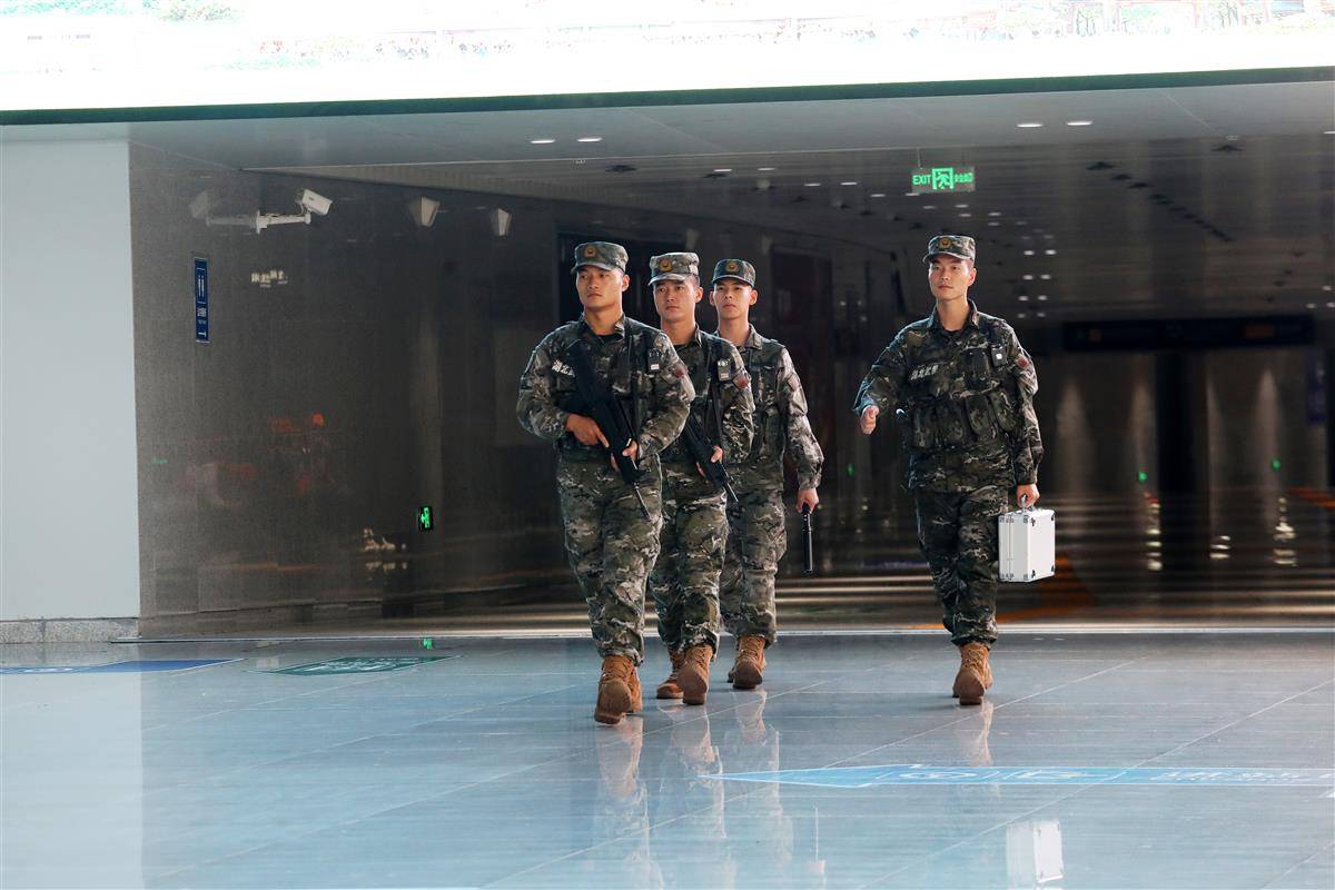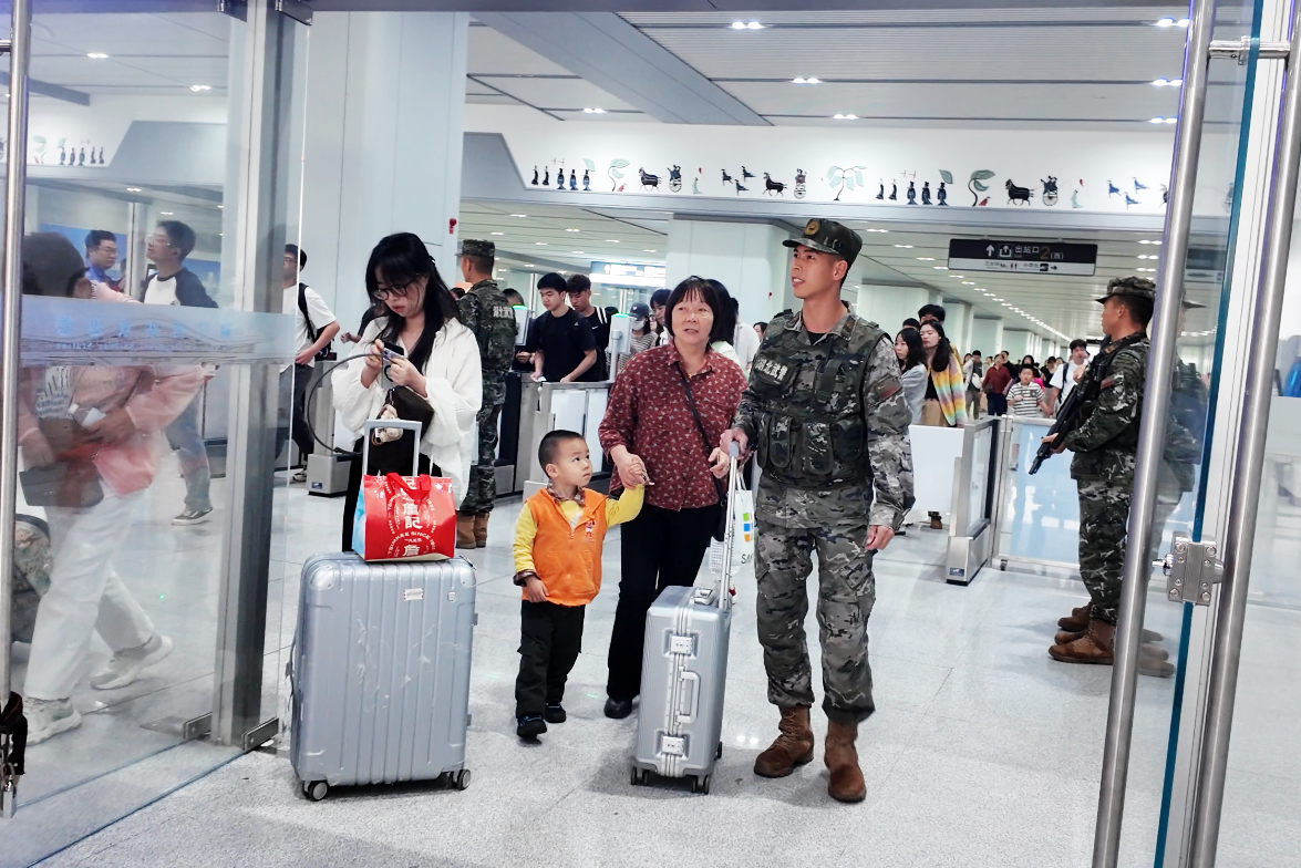 在火车站,官兵们在站前广场、进出站口等重点部位加强巡逻警戒,协助站点工作人员引导旅客有序进出,为游客提供温情服务。