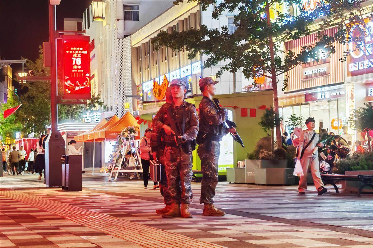 在步行街,官兵们守护在繁华交叉口,在熙熙攘攘的人群中穿梭巡查,一身橄榄正气与城市烟火气交相辉映,让这个国庆假期格外的温情。