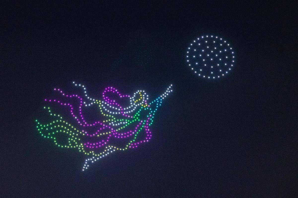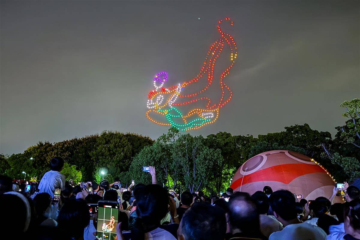 2025年10月3日,国庆遇中秋,武汉园博园夜空被点亮!千架无人机变出巨型月饼、嫦娥追月,科技浪漫撞传统,这波空中表演太绝了!(湖北日报全媒记者 倪娜 通讯员 徐志刚 摄)