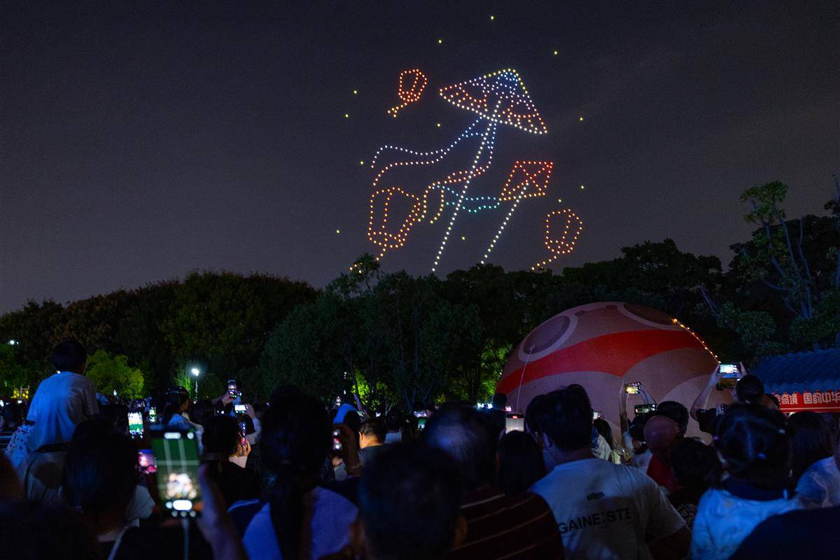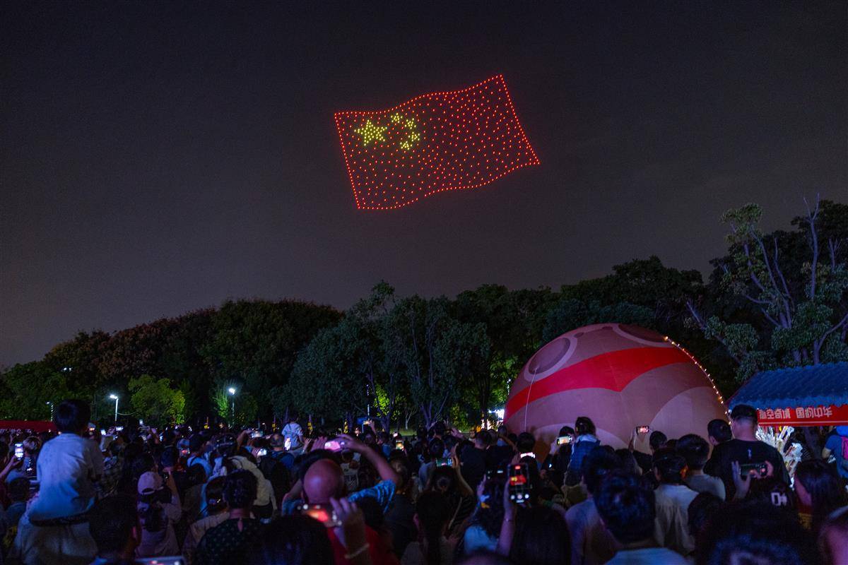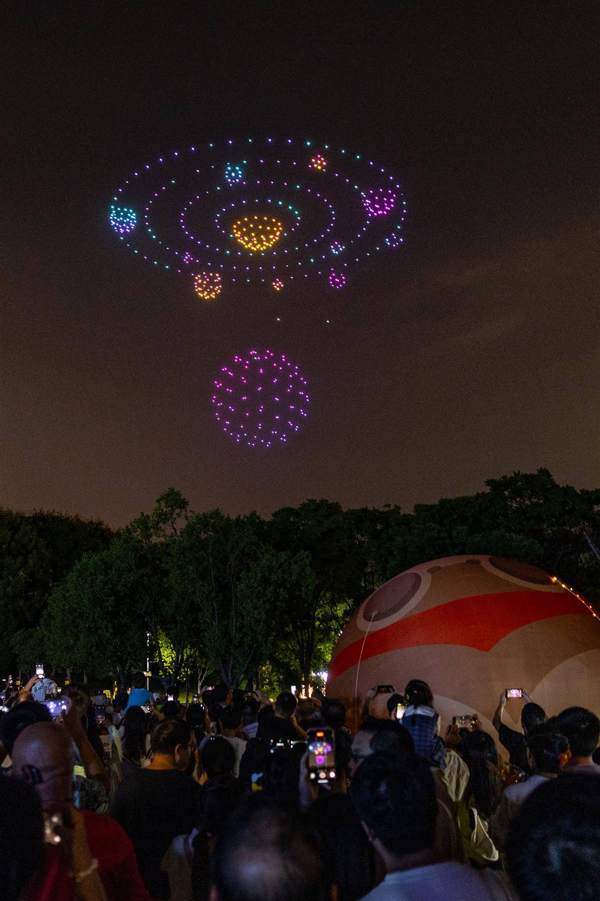 2025年10月3日晚,武汉园博园无人机表演吸引了大批游客。