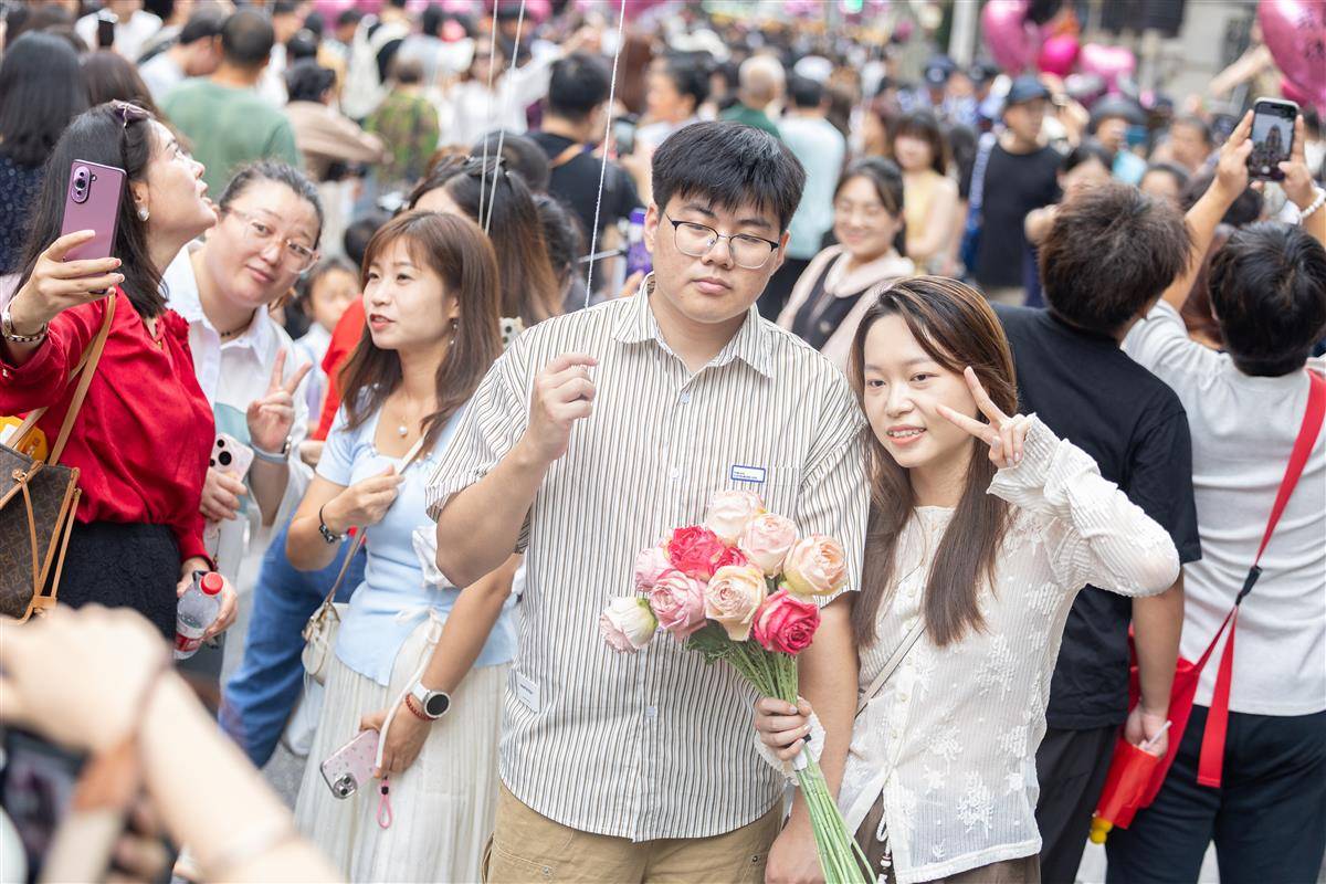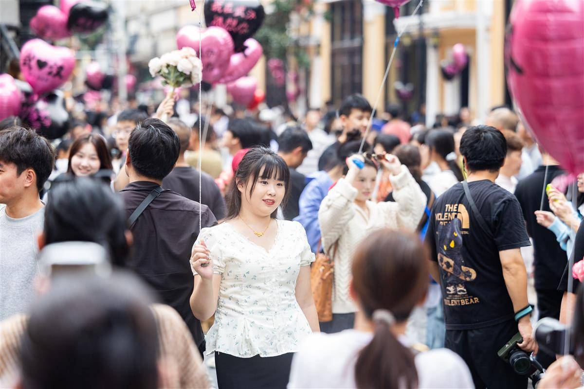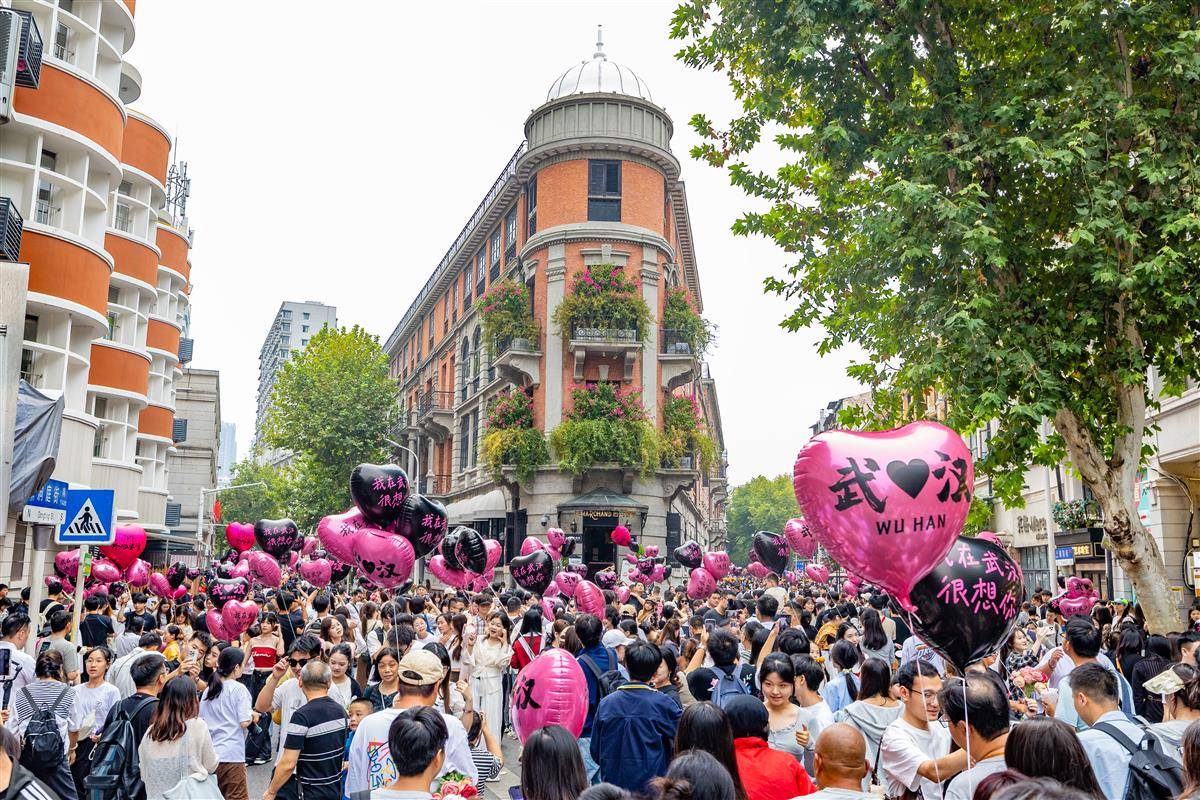 2025年10月4日,“十一”小长假第四日,在武汉市江岸区汉口历史风貌区,大批游客手持气球、鲜花在巴公房子拍照打卡。巴公房子经过修缮与保护如今成为外地游客来武汉游玩的必去景点。(湖北日报全媒记者 何宇欣 摄)