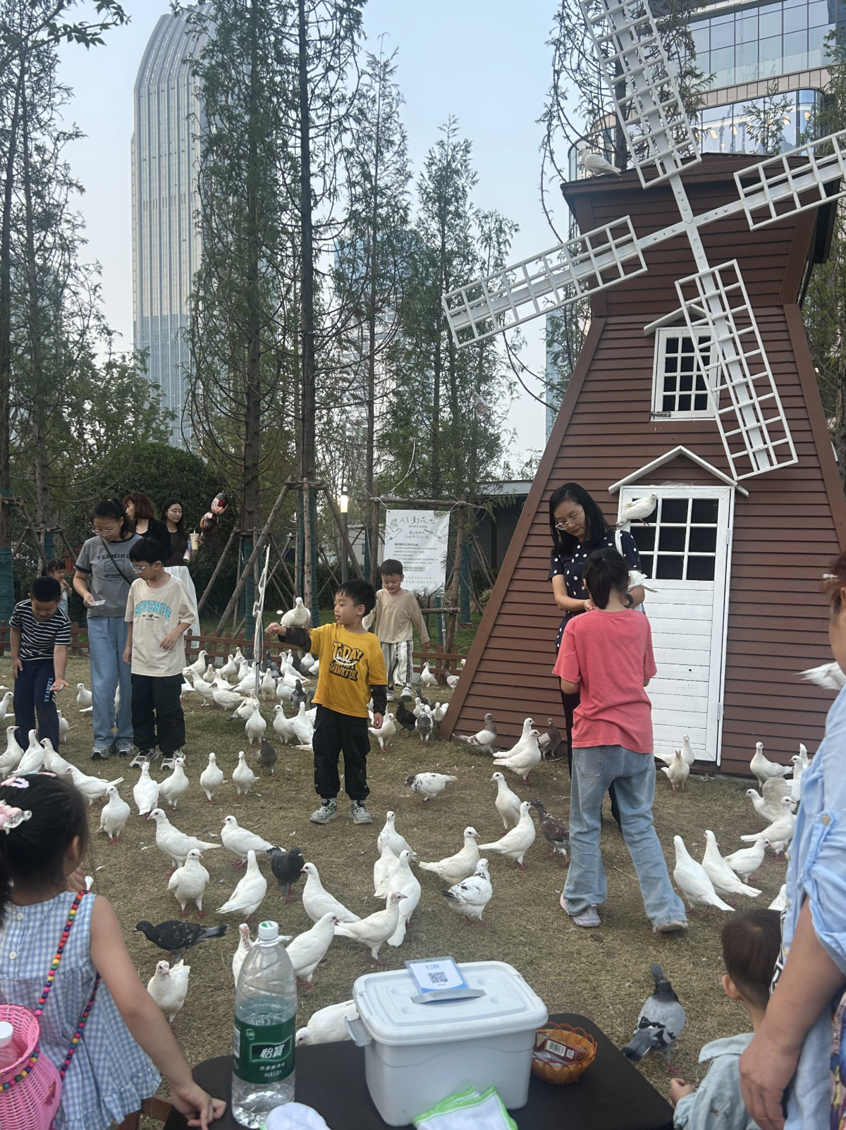 市民王女士带着孩子喂鸽子,鸽子站在孩子手臂上不肯飞走。王女士说:“逛商场,不仅仅是购物,还可以是微度假。”