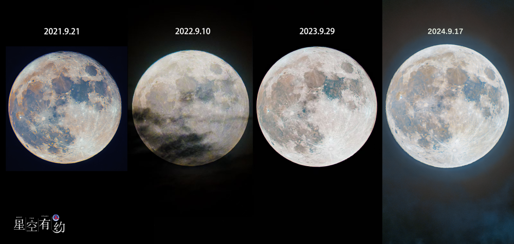 连续四年在广西南宁市拍摄的中秋月特写(拼版)。(王晋 摄)
