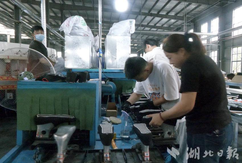 10月5日,湖北军盛制鞋工业有限公司车间内一派热火朝天的生产景象。生产线上,操作员将原材料放入生产模具,经过热塑设备加温挤压成型,随后拿到下一道工序进行修整毛边、打包装箱。