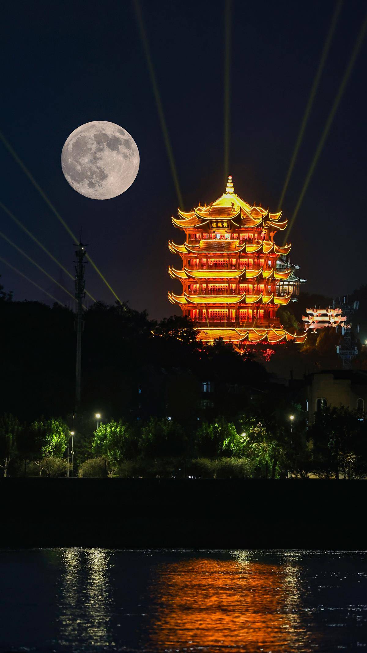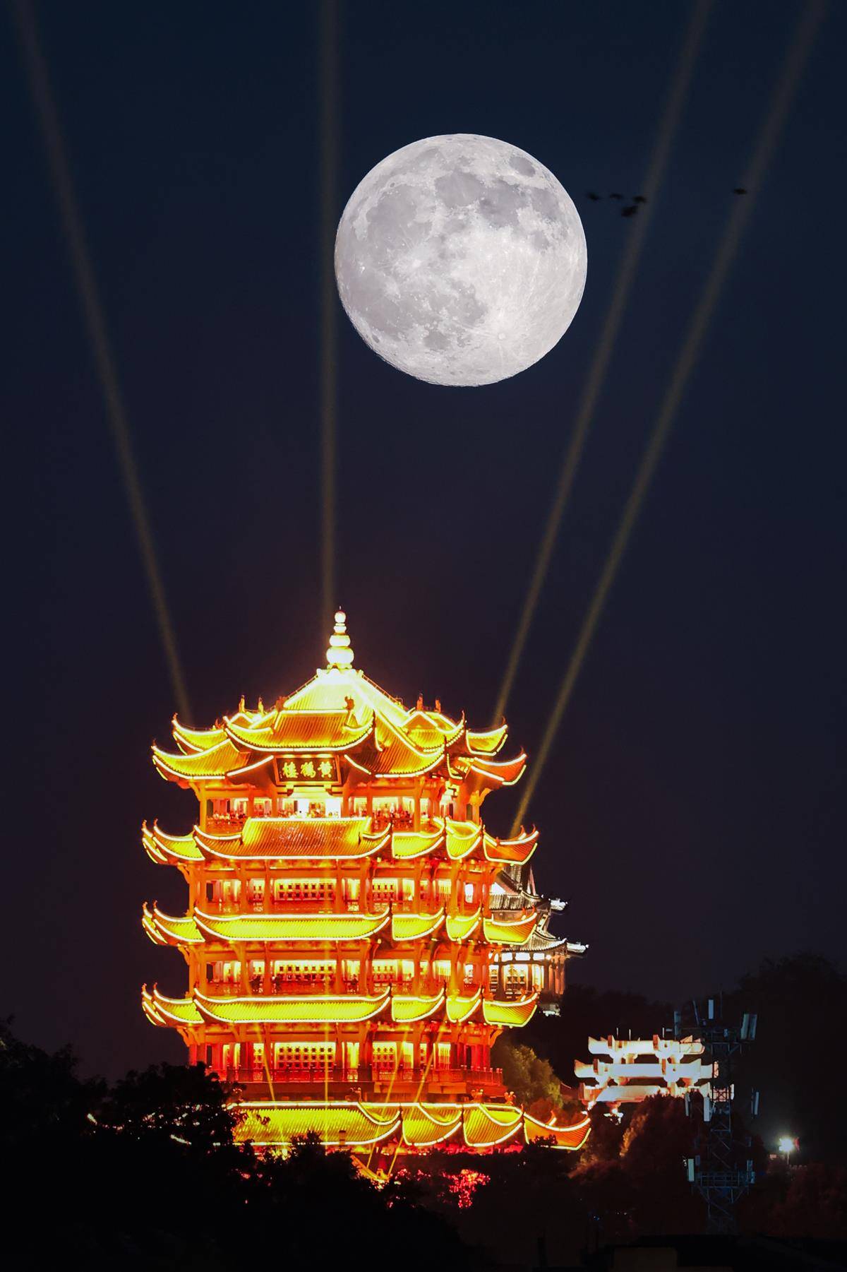 2025年10月6日晚,中秋佳节,武汉黄鹤楼上明月高悬,飞鸟掠过,极具诗意!(注:图片使用多重曝光现场拍摄 湖北日报全媒记者 何宇欣 摄)