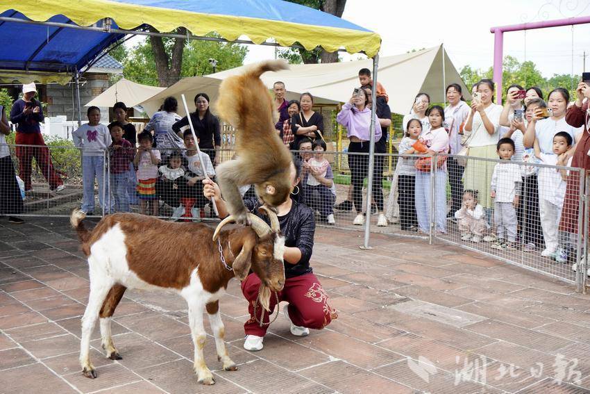 舞台表演结束后,不少游客涌向园区另一侧的动物表演区—这里的“萌宠杂技秀”同样人气爆棚。记者在现场看到,伴随着欢快的音乐,三只训练有素的小狗率先登场,它们不仅能稳稳地跳过障碍物,还能和驯兽师一起跳绳,灵活的动作引得台下小朋友阵阵欢呼;随后上场的小猪更是“身怀绝技”,在驯兽师的指挥下,它们迈着小短腿钻圈、跨栏,还能给地面铺上地毯,憨态可掬的模样让现场笑声不断;最后登场的猴子则展现了“高空技巧”,它顺着棍子灵活攀爬,现场展示踩高跷,还能在山羊的背上倒立,惊险又有趣的表演让游客们纷纷拍手叫好。
