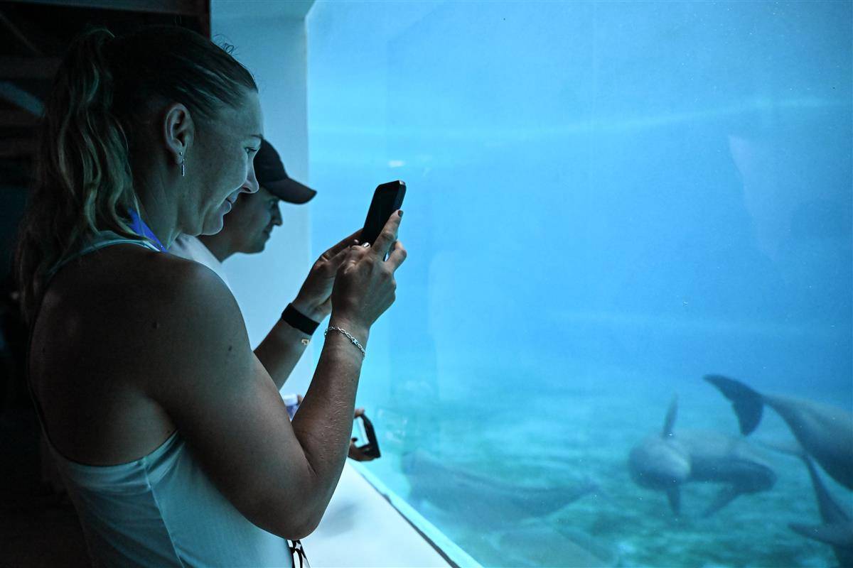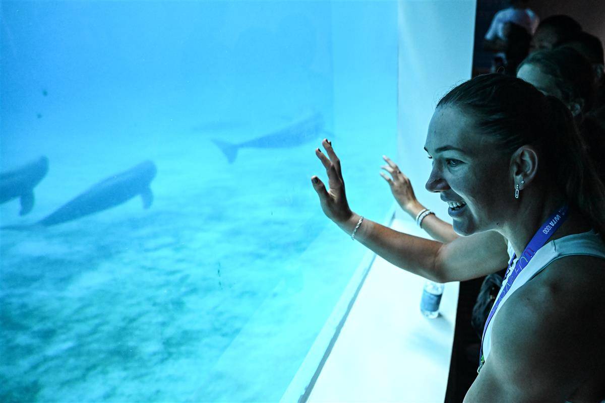 10月7日,武网参赛选手梅里查尔在中国科学院水生生物研究所白鱀豚馆与江豚互动。(湖北日报全媒记者 任勇 摄)