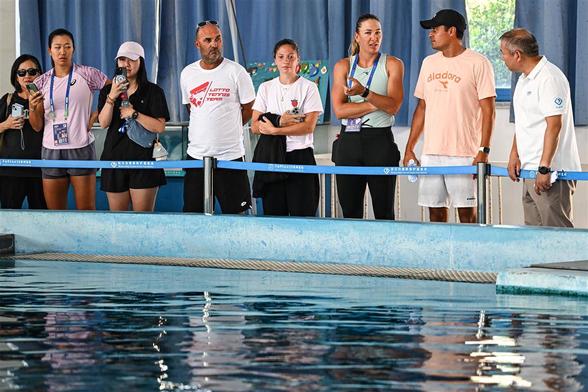 10月7日,2025WTA1000武汉网球公开赛参赛球员布朗泽蒂、鲁季奇、托莫娃、梅里查尔和谢淑薇来到中国科学院水生生物研究所白鱀豚馆参观,与江豚隔着玻璃亲密互动。