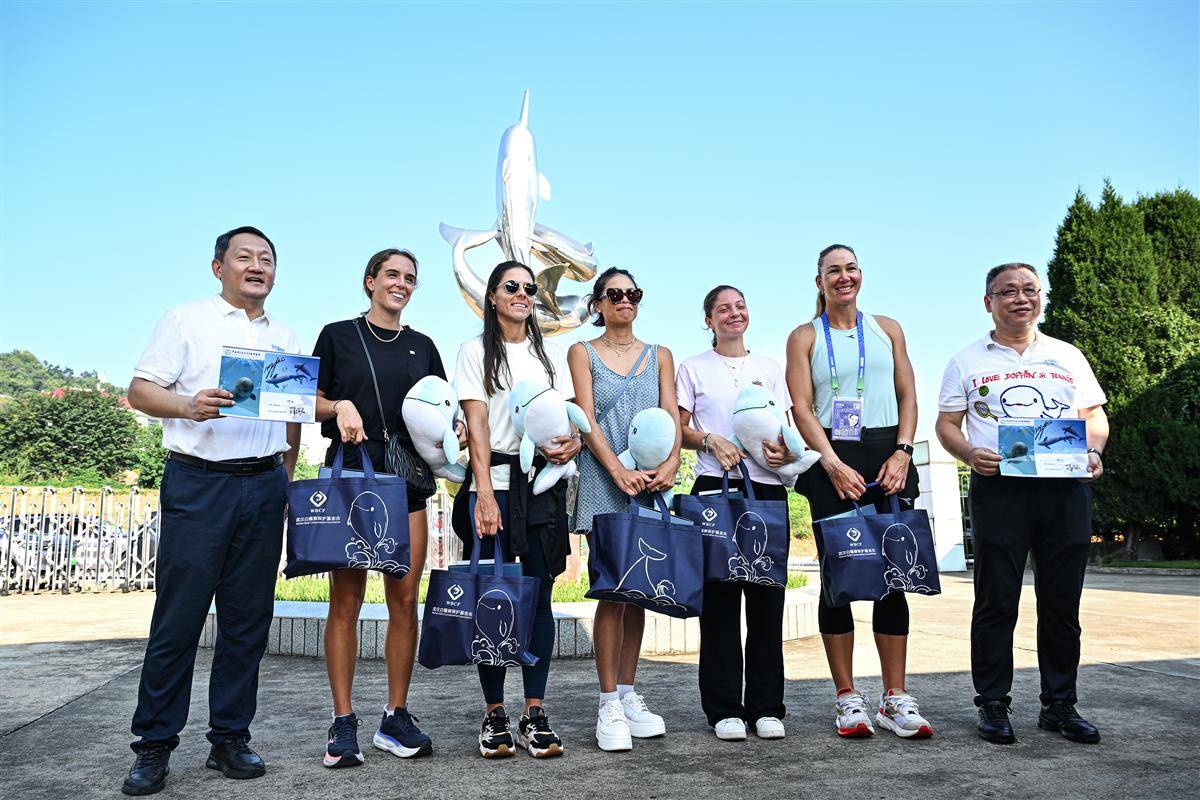 10月7日,武网参赛选手布朗泽蒂、鲁季奇、托莫娃、梅里查尔和谢淑薇参观中国科学院水生生物研究所白鱀豚馆合影。(湖北日报全媒记者 任勇 摄)