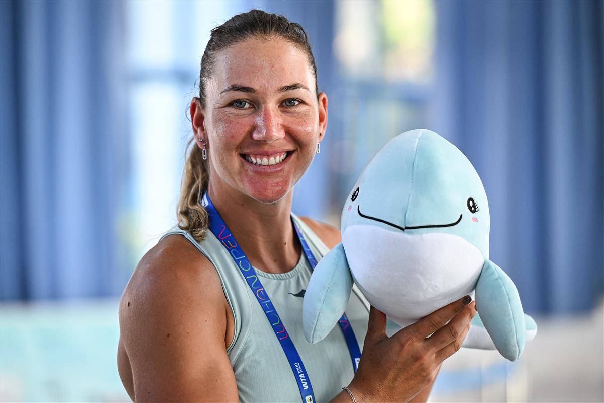 10月7日,武网参赛选手梅里查尔在中国科学院水生生物研究所白鱀豚馆与江豚玩偶合影。(湖北日报全媒记者 任勇 摄)