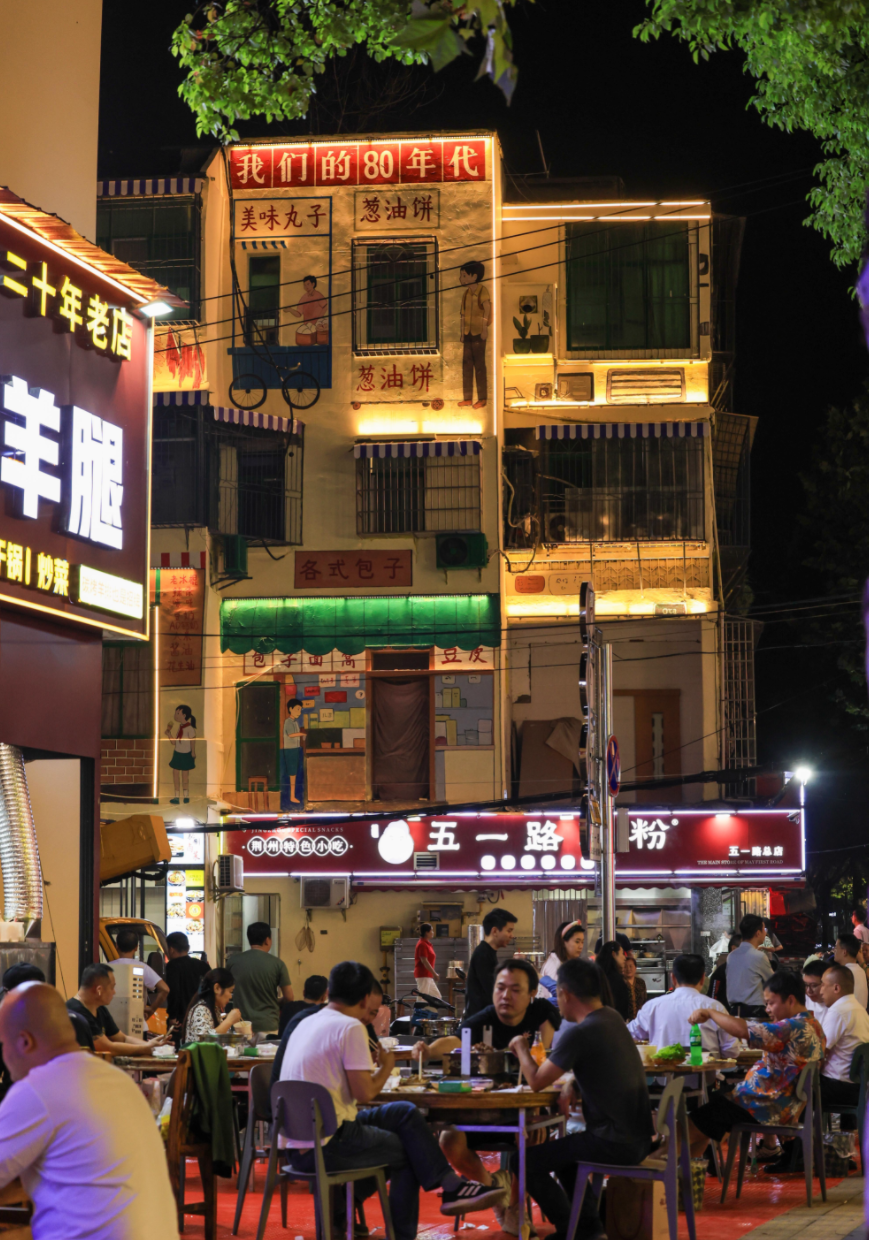 来到沙市区解放路与五一路街区,“烟火气”扑面而来,烤串、火锅、米粉、凉虾……各类美食琳琅满目,满满的“沙市味道”。街区在国庆节前夕刚刚完成提档升级,以“20世纪80年代复古风”惊艳亮相,氛围感拉满。