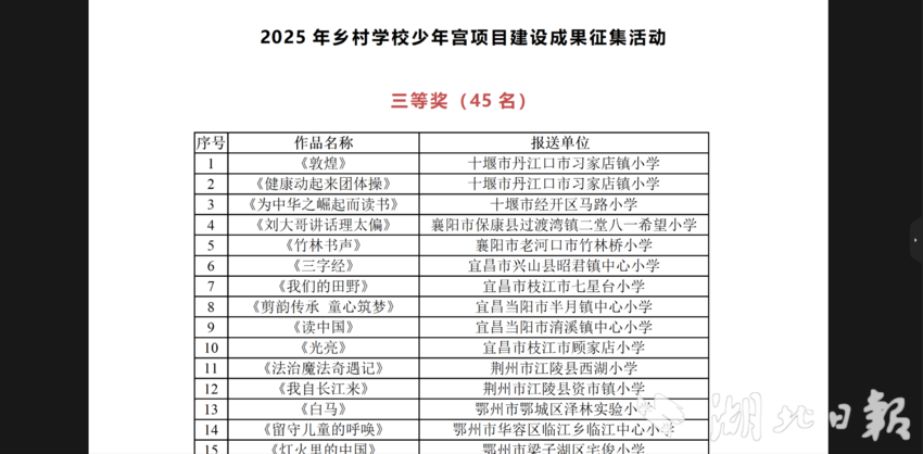 湖北日报客户端讯(通讯员 尹如伟 常美娜 余梦婷)近日,从湖北文明网公示信息中传来喜讯:丹江口市习家店镇小学选送的《敦煌》与《健康动起来团体操》两份作品,在2025年湖北省乡村学校少年宫项目建设成果征集活动中双双荣获“三等奖”,用艺术与运动的双重魅力,生动展现了乡村学子的别样风采。