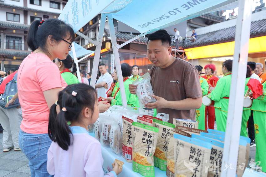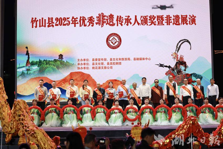 湖北日报客户端讯(通讯员徐丹、王寿成、章伟)非遗润竹山,匠心桃花源。10月7日晚,竹山县桃花源街区女娲广场灯火通明,2025年优秀非遗传承人颁奖暨展演活动在此举行,3000余名游客与市民驻足观赏,沉浸式感受传统技艺的文化魅力。这场“静态展示+动态表演”的文化盛宴,正是当地以非遗激活文旅产业融合发展的生动缩影。