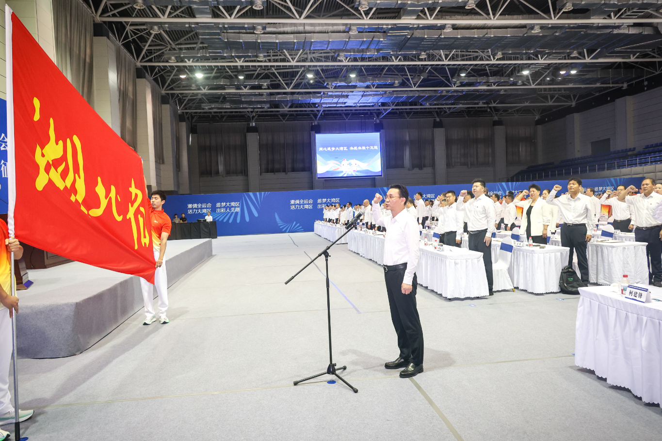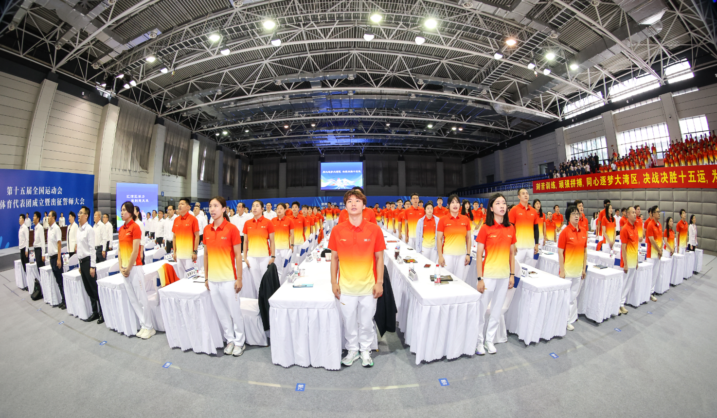 “我宣誓,我光荣地参加第十五届全运会,我将勇于担当,顽强拼搏,团结协作,勇创佳绩,赛出风格赛出水平,坚决遵守赛风赛纪,坚决反对兴奋剂,力争运动成绩与精神文明双丰收,为全运争辉,为湖北添彩。”成立大会上,湖北体育健儿的铮铮誓言响彻全场。他们立志在粤港澳全运会舞台高扬荆楚旗帜,为湖北建成中部地区崛起重要战略支点贡献体育力量!