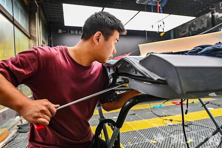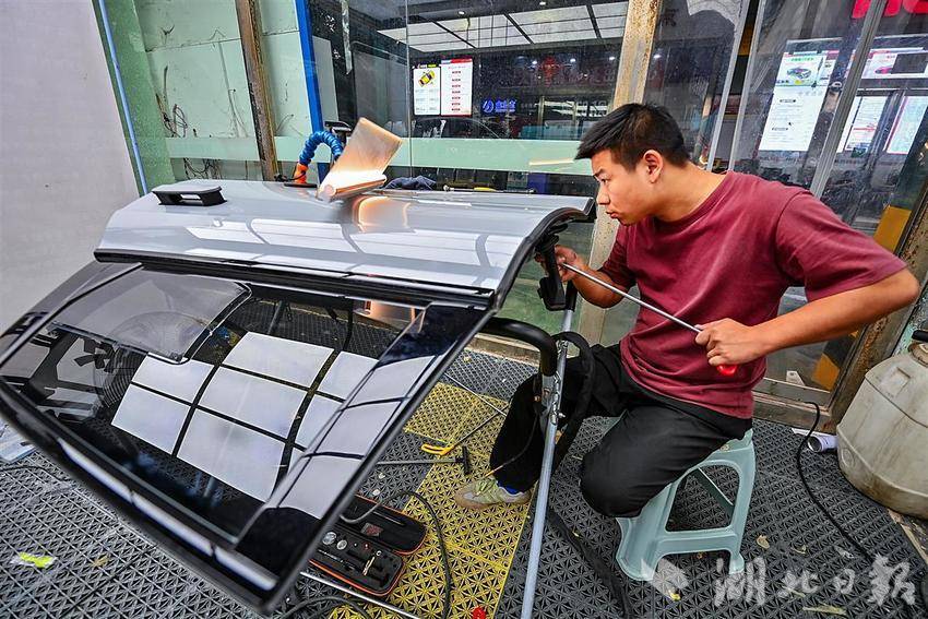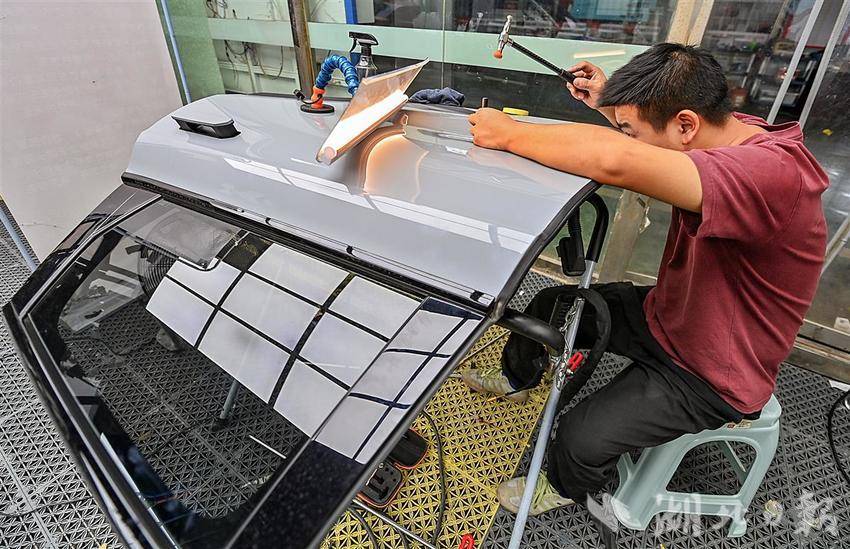 10月10日,武汉仁和路某汽车修理厂车间里,叶师傅正在进行汽车凹陷修复工作。汽车凹陷修复是一种基于光学、物理及力学原理的无损修复技术,通过杠杆原理在不破坏原车漆的前提下恢复车身凹陷,主要适用于未掉漆的锐角、钝角凹陷及冰雹坑。叶师傅称,相较于传统钣金修复需打磨车漆并经历多道喷涂工序,凹陷修复技术省略了喷漆环节。目前武汉已有60多家汽车修理厂开展汽车凹陷修复业务。(湖北日报全媒记者 朱熙勇 摄)