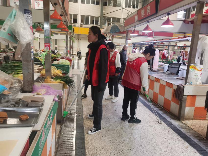 湖北日报客户端讯(通讯员 张珊珊)10月10日下午,襄阳高新区团山镇蔡庄社区携手包保单位高新区行政审批局,组织社区全体工作人员及“双报到”党员,在蔡庄农贸市场开展洁城志愿服务活动,以共建力量守护辖区环境整洁。