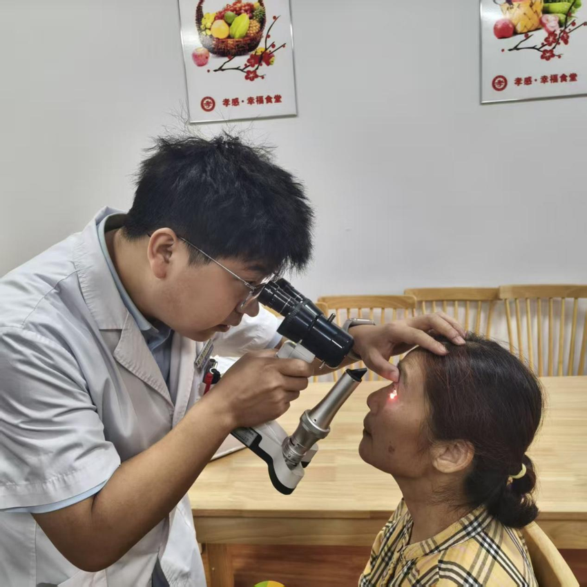 清晨,高庙社区幸福食堂内,居民们有序排队等候检查。在临时搭建的眼科诊室里,来自孝感爱尔眼科的医疗团队为居民提供“一站式”眼健康服务。