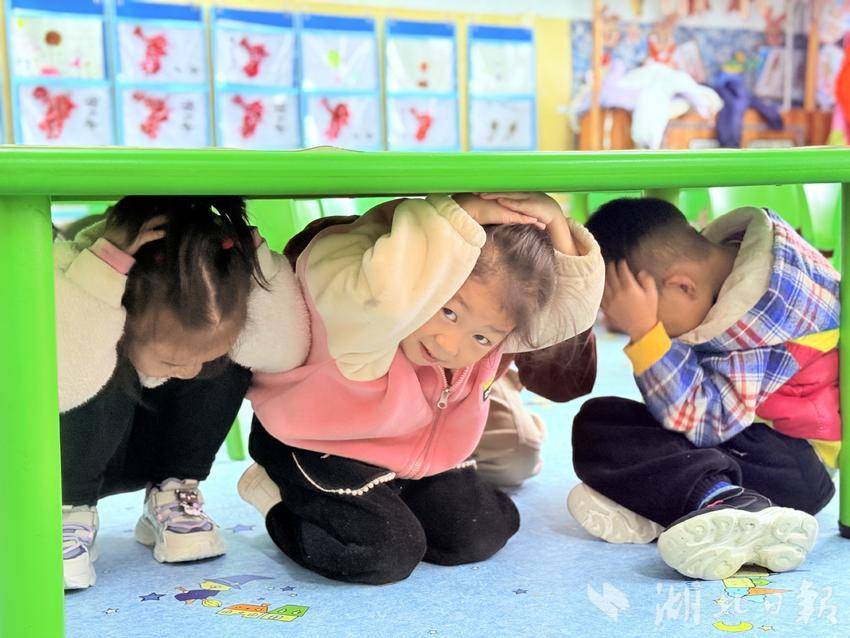 最受孩子们欢迎的是“模拟逃生演练”环节。随着模拟地震警报响起,教师们迅速组织幼儿双手抱头、蹲在课桌下避险;警报解除后,又带领孩子们按照预定路线,弯腰、扶墙、快速有序地撤离到操场安全区域,整个过程紧张有序,孩子们都能听从指令完成动作。演练结束后,教师还通过儿歌、提问等互动,帮助幼儿巩固“不慌张、听指挥、快撤离”的逃生要点。