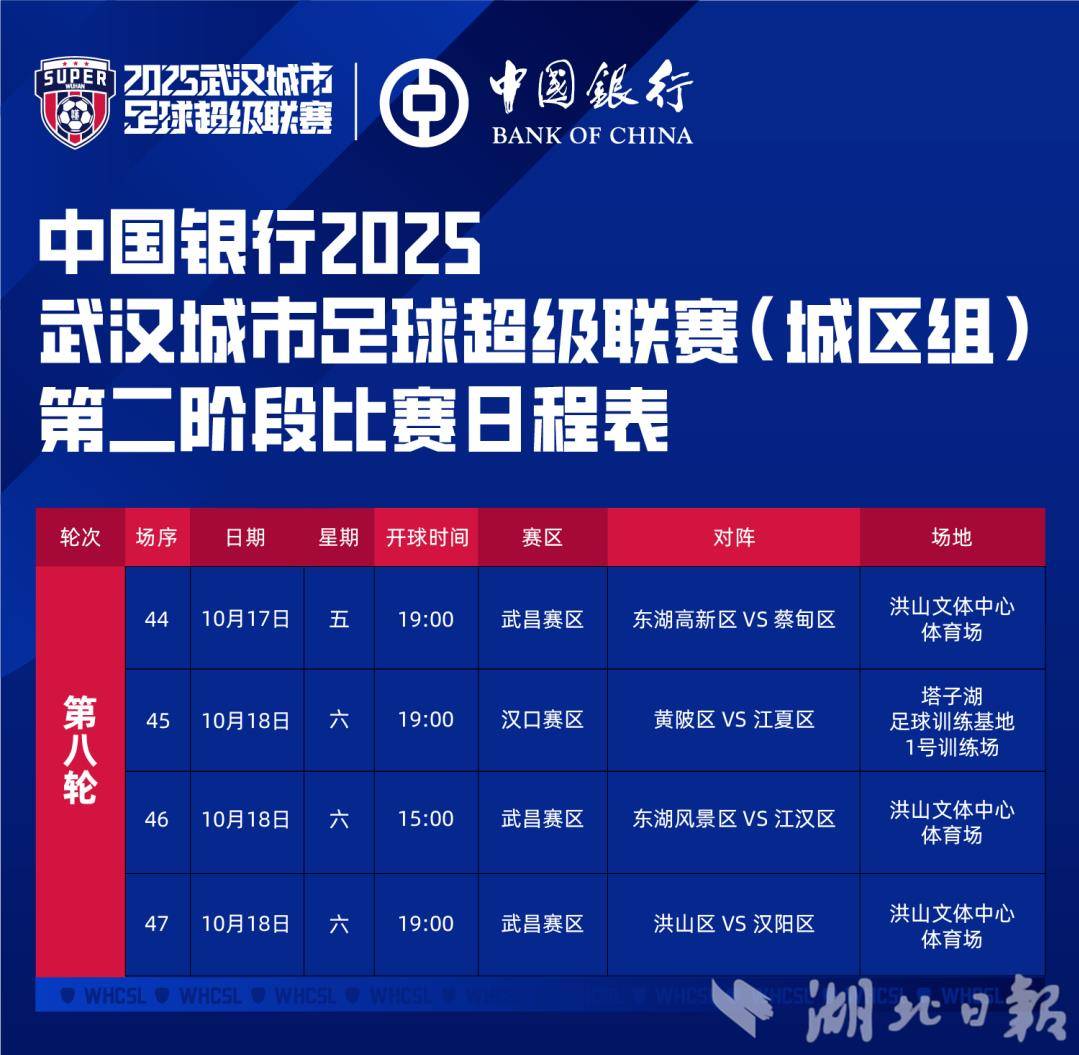 湖北日报讯(记者汪洋)10月13日晚,2025武汉城市足球超级联赛组委会公布城区组第八轮比赛日程表。10月17日至18日,汉超晋级第二阶段的九支城区队,除江岸区轮空外,其余八支城区队将进行4场比赛,具体为: