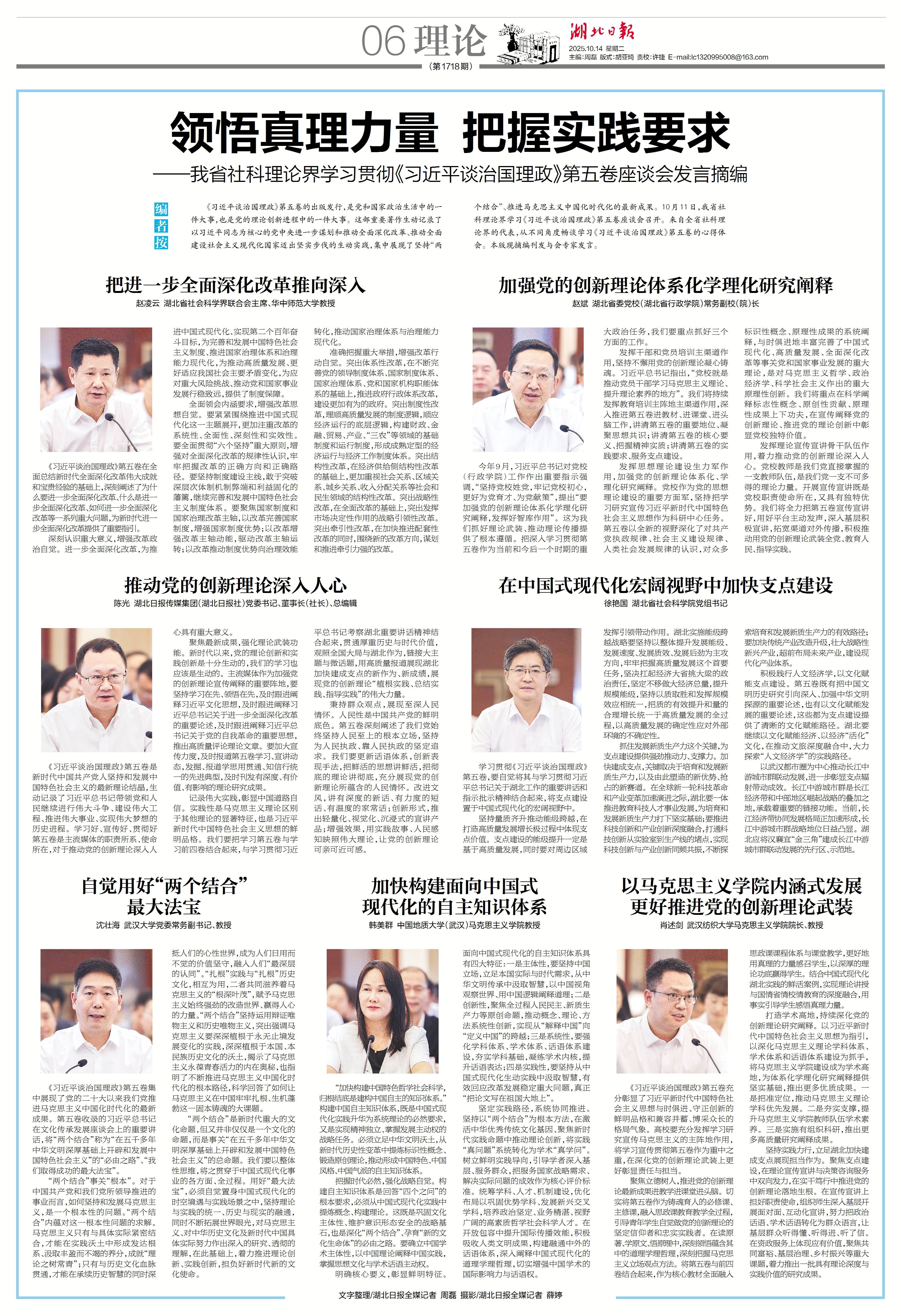 记录伟大实践,彰显中国道路自信。实践性是马克思主义理论区别于其他理论的显著特征,也是习近平新时代中国特色社会主义思想的鲜明品格。我们要把学习第五卷与学习前四卷结合起来,与学习贯彻习近平总书记考察湖北重要讲话精神结合起来,贯通厚重历史与时代价值,观照全国大局与湖北作为,链接大主题与微话题,用高质量报道展现湖北加快建成支点的新作为、新成绩,展现党的创新理论“植根实践、总结实践、指导实践”的伟大力量。