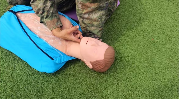 开营仪式中,学生们身着整齐校服,以饱满的精神状态开启当日旅程。“急救与包扎”环节,教官手持模拟绷带,细致演示伤口包扎的每一个步骤,学生们两两一组,小心翼翼地为同伴“包扎伤口”,从手忙脚乱逐渐变得熟练配合。从海姆立克急救法的“剪刀、石头、布”手势教学,到CPR心肺复苏的按压位置、力度演示,教官手把手指导,学生们认真练习每一个动作,稚嫩的脸庞上满是严肃与认真。