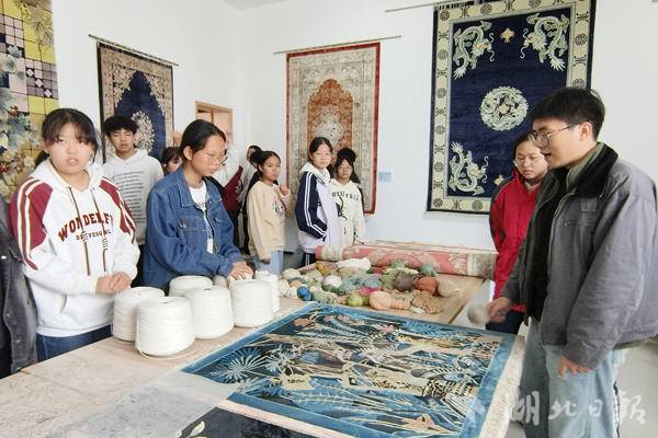 在一楼的非遗展馆,研学团队参观学习了武当道医道药、武当太乙五行拳、张三丰传说、伍家沟故事、吕家河民歌、均州挂毯、武当八段锦等非遗项目传承人工作室及其展品,听取了讲解员小李对十堰市非物质文化遗产均州挂毯制作技艺进行的详细讲解。