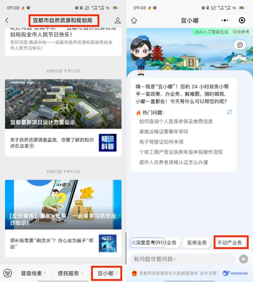 过去,市民和企业想要了解不动产登记相关信息,往往需要浏览大量网页或致电咨询。现在,只需关注“宜都市自然资源和规划局”微信公众号,在对话框内输入任何相关问题,“宜小嘟”都能快速响应,提供精准、权威的解答,同时,对话框上方也设置有快速通道,点击“不动产业务”,即可直接进入高频事项进行对话。