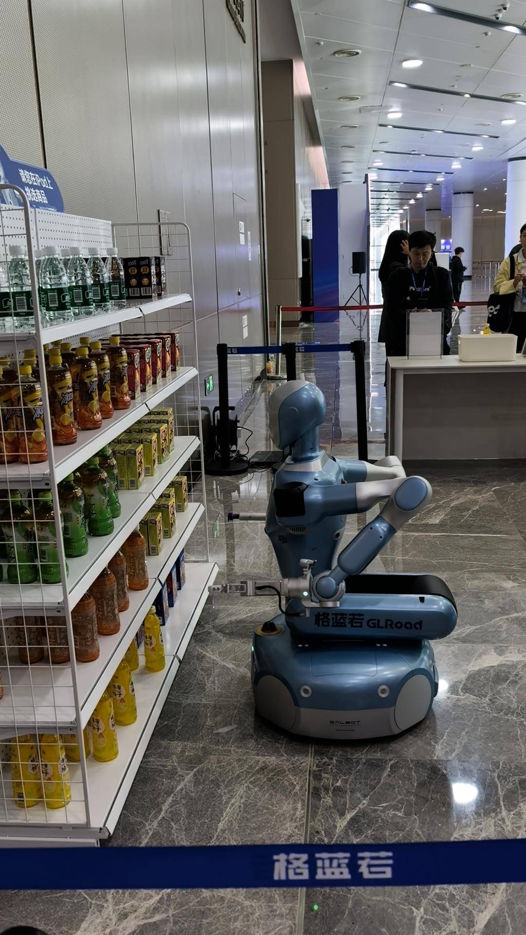 上到三楼,一台被人群包围的机器人正在卖力工作。一位女士触摸电子屏下单,机器人便“走”到货架前找到货物取出,送到女士手边。“我还是第一次看到这样的机器人,真聪明!”女士满意地接过货物,引得大家纷纷排队体验。“这是我们公司去年四月接到的订单,研发的机器人,除了识别货物、取货送货、它还会整理货物等,今天算是首次正式亮相。”武汉格蓝若智能机器人有限公司项目经理陈燕介绍说,这款机器人可以应用在无人超市、无人药店等,刚一发布就已有零星订单。