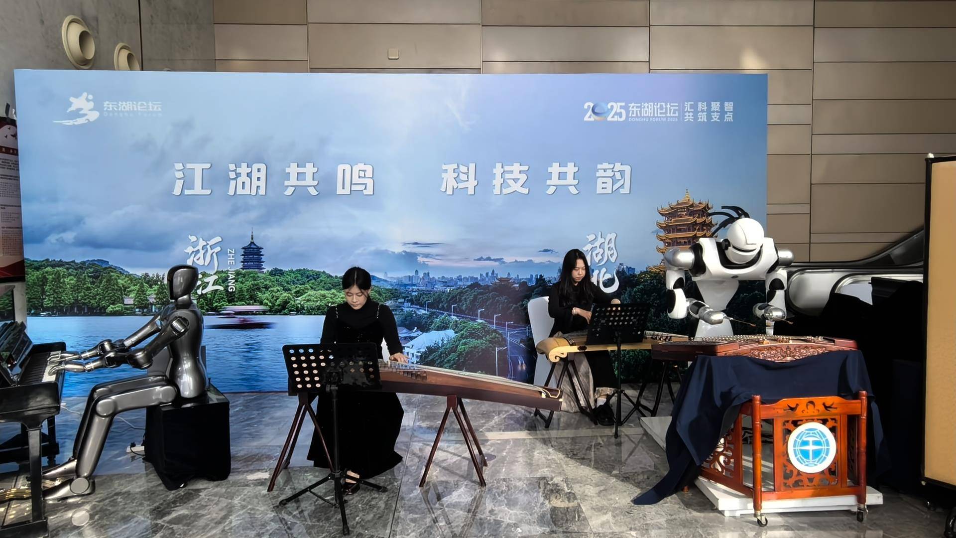 左边是侧对观众、“正襟危坐”的机器人弹着钢琴,右边是名为“海百合”的机器人面对观众、轻触琴弦奏响扬琴;而中间,是两位专业演奏者以古筝和古琴和音,四“人”共同奏响《高山流水》,欢迎来自世界各地的知音。10月14日,2025东湖论坛上,嘉宾们一步入会场一楼,便看到这充满未来感与穿越感的一幕,纷纷拿出手机拍视频。
