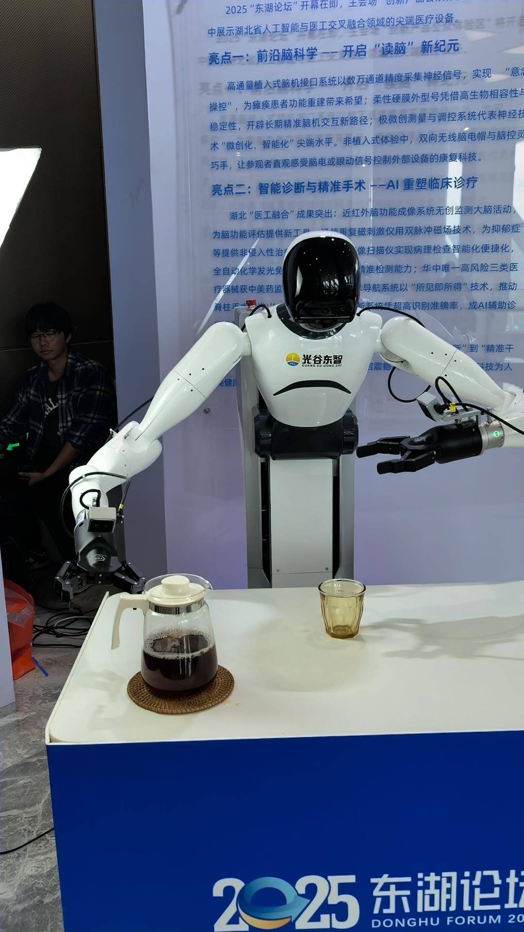 与往届不同的是,今年,论坛上的“机器人”浓度激增,湖北的机器人“天团”在会场各处“炫技”,泡茶、送货、看病……展示着未来生活的无限可能。