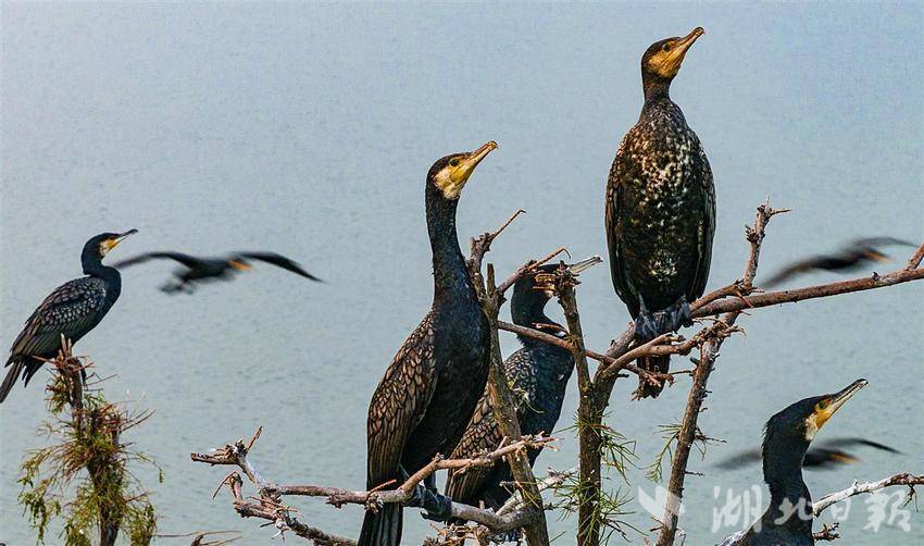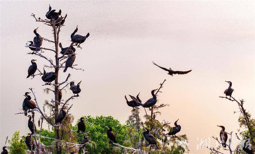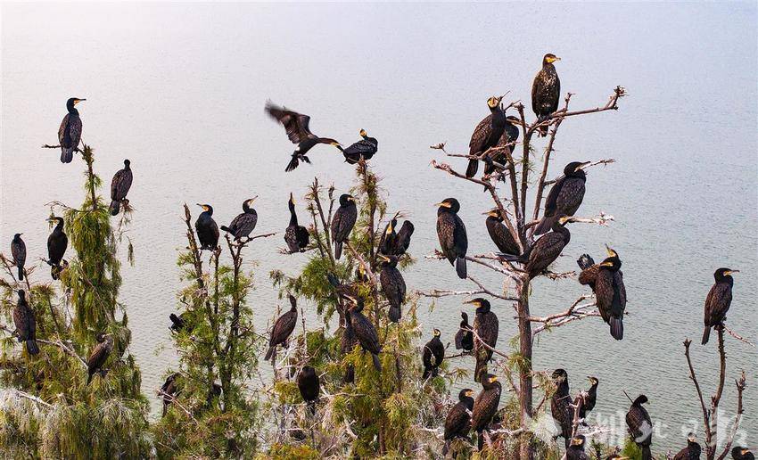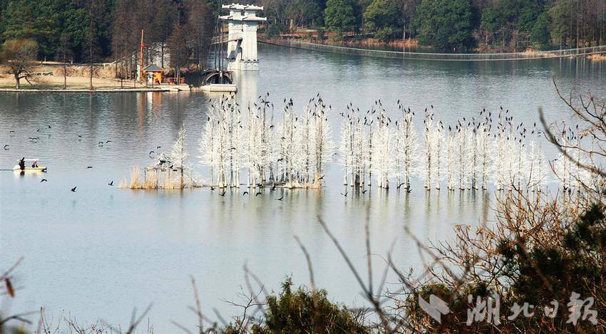 10月14日,成百上千只鸬鹚把武汉东湖落雁鸟岛的部分水杉树“刷”成白色,白茫茫一片,好像雪白色的“雾凇”。目前,鸟岛上只有少量鸬鹚栖息,11月份这里将迎来更多鸬鹚,整个岛上的杉林都会被鸟儿的排泄物“刷白”。鸬鹚是冬候鸟,以捕鱼为食,每年10月中旬候鸟陆续来武汉越冬,第二年的3月份离开,也有部分候鸟留下来成为留鸟。近年来景区生态不断升级改造,鸟岛的面积扩大一倍多,加上限制游人上岛,这里便成了候鸟的天堂。(湖北日报全媒记者 朱熙勇 摄)