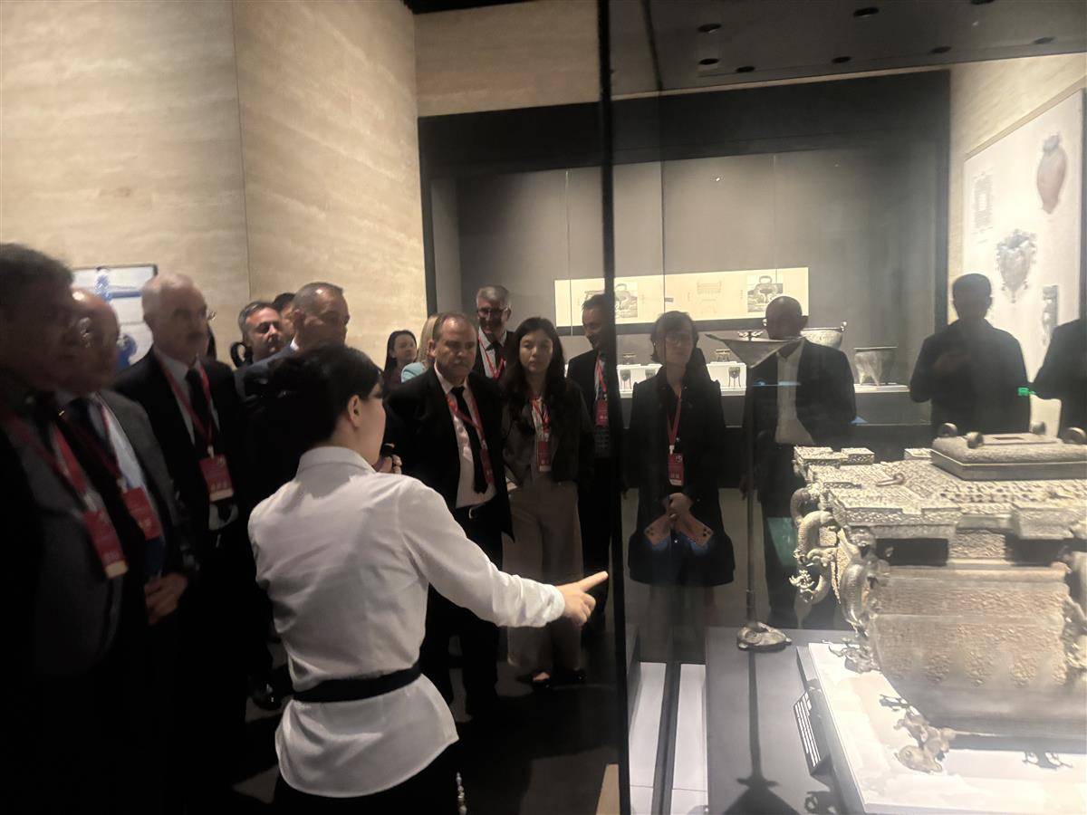 现场嘉宾随后在博物馆展厅内参观,被誉为“天下第一剑”的越王勾践剑前围满了好奇的目光。其千年不腐的特质与精湛工艺让嘉宾们纷纷俯身细观,惊叹不已。不远处,曾侯乙墓出土的铜建鼓座、铜鹿角立鹤等文物同样引人入胜。