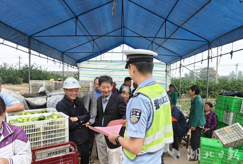 在柑橘飘香的收购点,民警结合秋收时节交通特点,围绕老年群体出行安全、三轮车规范驾驶、头盔佩戴重要性等主题,用乡音乡语讲解典型案例,发放图文并茂的宣传手册,让交通安全知识“入耳入心”。民警还现场引导果农和商贩规范停车、有序装卸,及时劝导占道停车、随意掉头等行为,在车流中守护一方畅通。