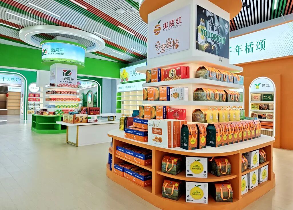 这座融合了生态与现代的展示展销中心面积约3600㎡,投资200万元,围绕宜昌八大重点农业产业链,规划打造了宜昌特色农产品展销区、宜荆荆恩馆、农旅文创互动体验区等11个特色区域和1个中央大厅。走进特色农产品展销区,夷陵牛、绿秀大米、洋红柑橘与当阳双莲鸡、远安瓦仓大米、秭归脐橙等名优特产琳琅满目,汇聚了宜昌市各县市区的农业精品。