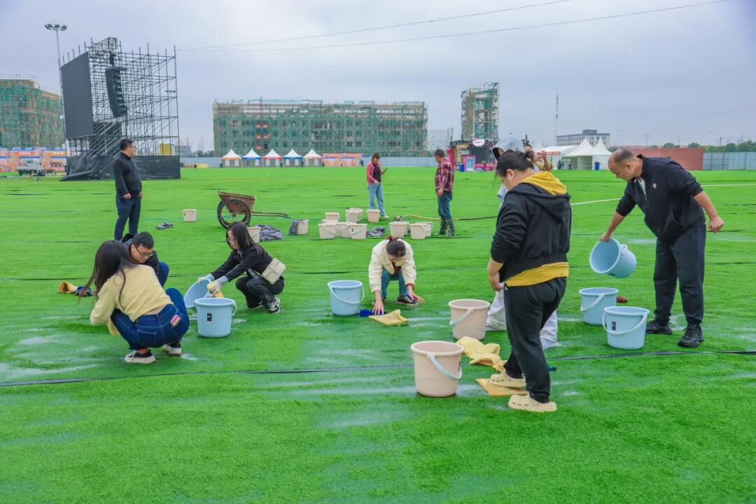 面对连续阴雨天气带来的挑战,樊城区迅速行动,加班加点将200多亩场地硬化,并铺设防水垫和人工草坪。各单位志愿者也纷纷开启“手搓式”排水模式,用双手一点点清理积水,只为让乐迷们能够安心享受这场音乐盛宴。