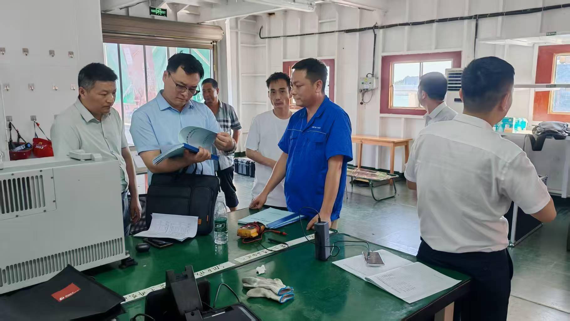杨维东(左二)下沉炬峰车间,与企业技术人员现场研讨生产流程优化方案。