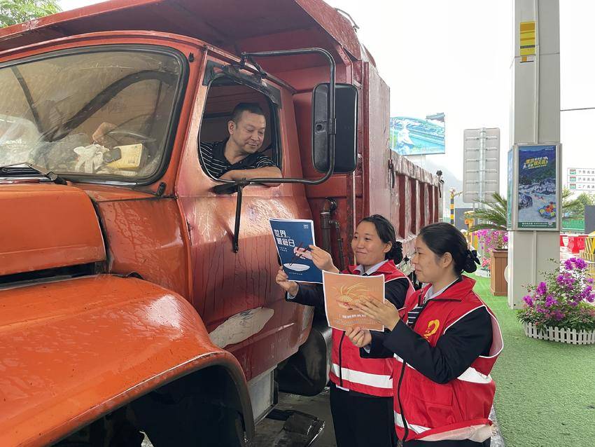 在职工食堂,“爱路-AiLu”志愿者们精心布置主题海报,图文并茂地介绍科学备餐与食品存储知识,引导职工按需取餐、践行“光盘行动”,从细节处落实节约理念。在收费车道,志愿者则利用服务窗口向过往司乘发放宣传单,并结合出行案例,现场讲解“旅途膳食合理规划”“车载食品保鲜技巧”等实用内容,帮助司乘在旅途中更加便捷、节约地安排饮食,减少食品浪费。