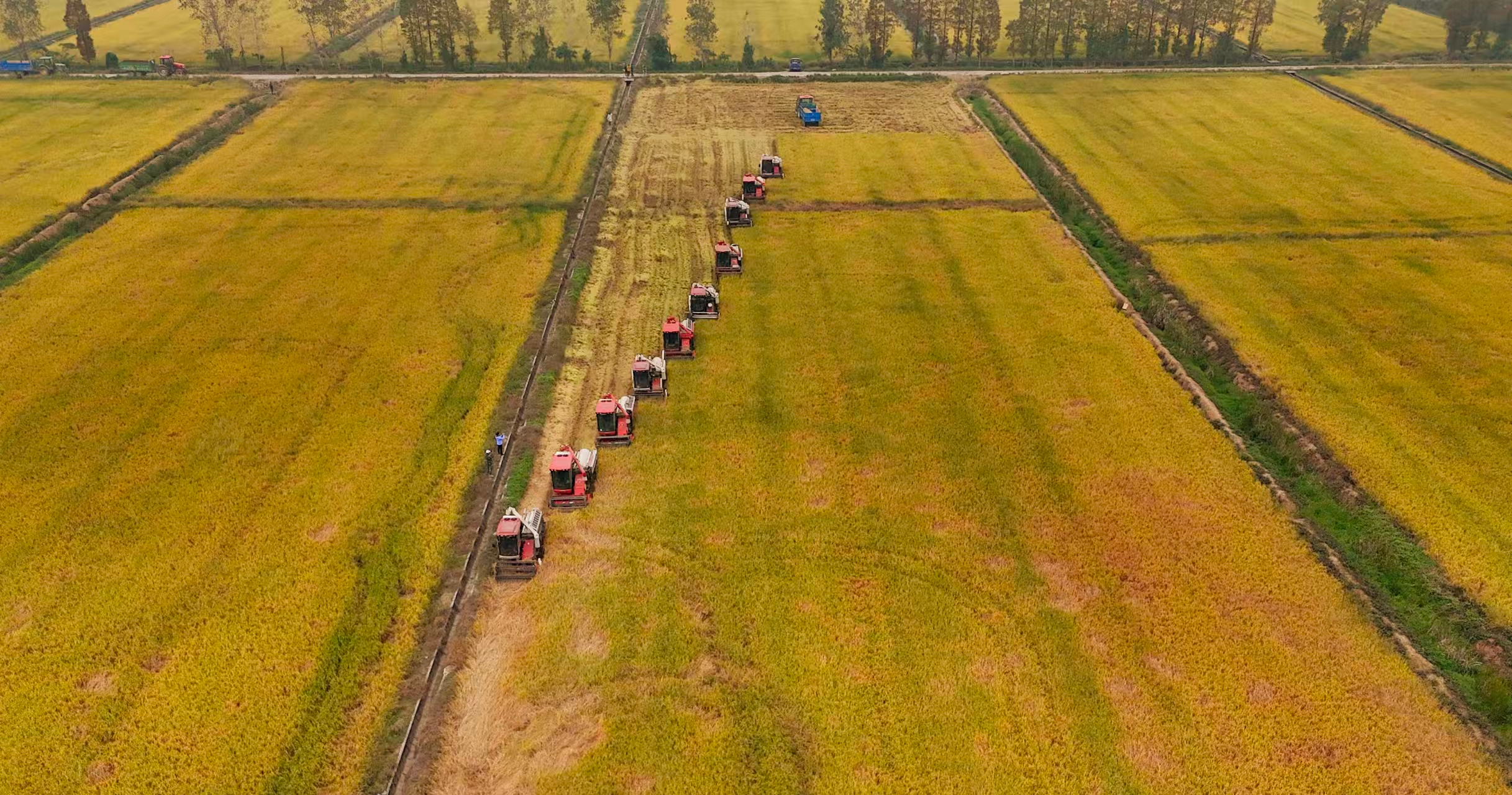 随着一声令下,20多台联合收割机浩浩荡荡驶向田间,金色的稻穗在机器的吞吐间化作饱满的谷粒,被源源不断地输送到运粮车上。