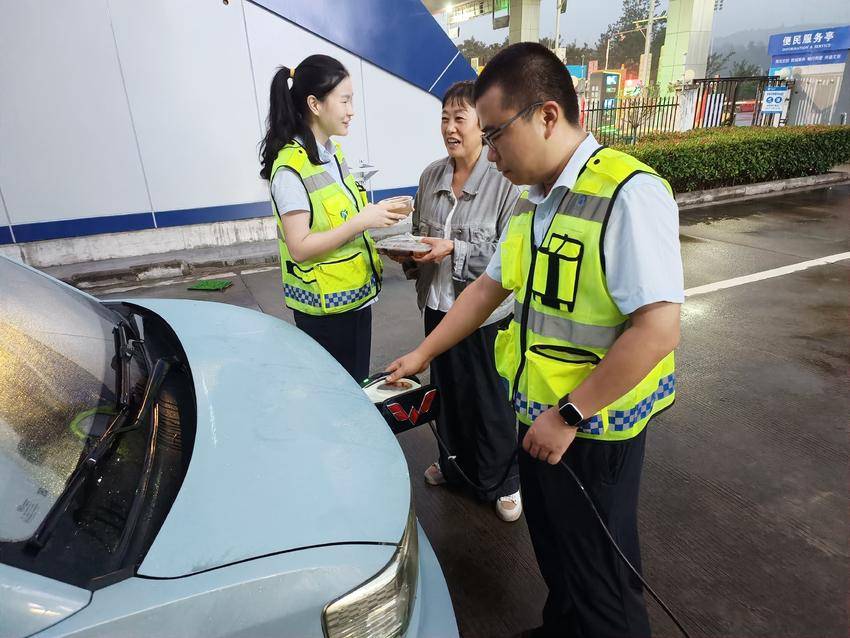 当时,车辆因电量耗尽被迫滞留在收费广场,窗外雨势未歇、视线模糊,司机内心焦急,只好冒雨走进收费站求援。值班人员见状,迅速启动应急帮扶机制。几位工作人员合力将车辆缓缓推至院内安全区域,连接好充电设备。见司机衣衫微湿、面带疲惫,他们又贴心递上热水与刚加热的饭菜,并引导司机至“爱心小屋”中避风休息。在充电等待期间,工作人员不仅耐心讲解雨天行车注意事项,还主动帮助规划后续行程路线,直至车辆恢复续航、司机安心启程。