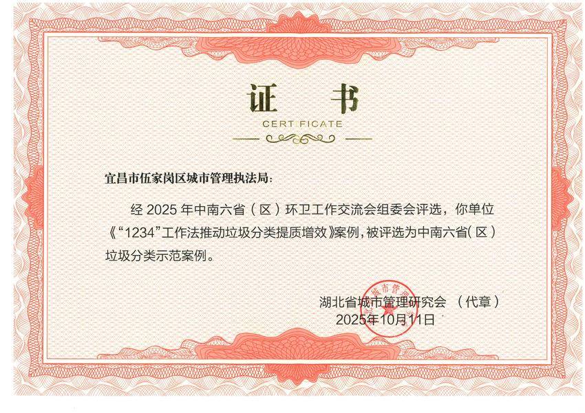 湖北日报客户端讯(通讯员 周璇)近日,从湖北省城市管理研究会传来喜讯,经中南六省(区)环卫工作交流会组委会评选,伍家岗区城市管理执法局提报的《“1234”工作法推动垃圾分类提质增效》案例,凭借其创新的机制、显著的成效和可持续的运行模式,在众多参选案例中脱颖而出,被正式评选为中南六省(区)垃圾分类示范案例。